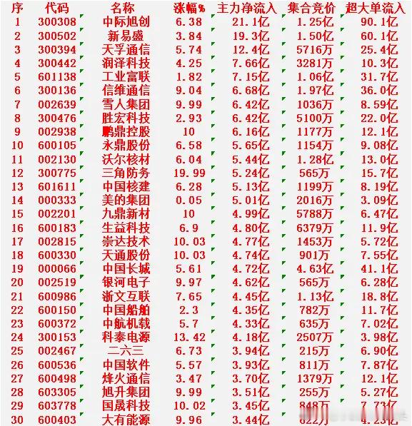 1月22日尾盘30分钟,主力资金“大幅抢筹的”30名单一览!中际旭创:净流入 21.1亿元,超大单流入 90.1亿元新易盛:净流入 19.3亿元,超大单流入 60.1亿元天孚通信:净流入 12.4亿元,超大单流入 25.4亿元润泽科技:净流入 7.66亿元,超大单流入 10.3亿元工业富联:净流入 7.15亿元,超大单流入 31.7亿元信维通信:净流入 6.68亿元,超大单流入 36.0亿元