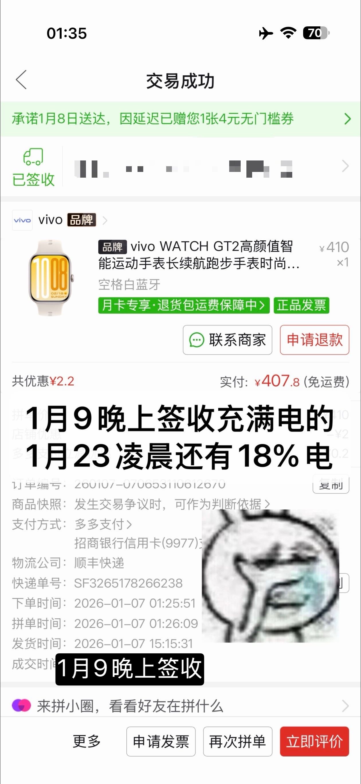 1月9号晚上充满开始戴1月23号凌晨还有18%的电vivo Watch GT2 400块钱的情绪价值充一次电,用TM两周了