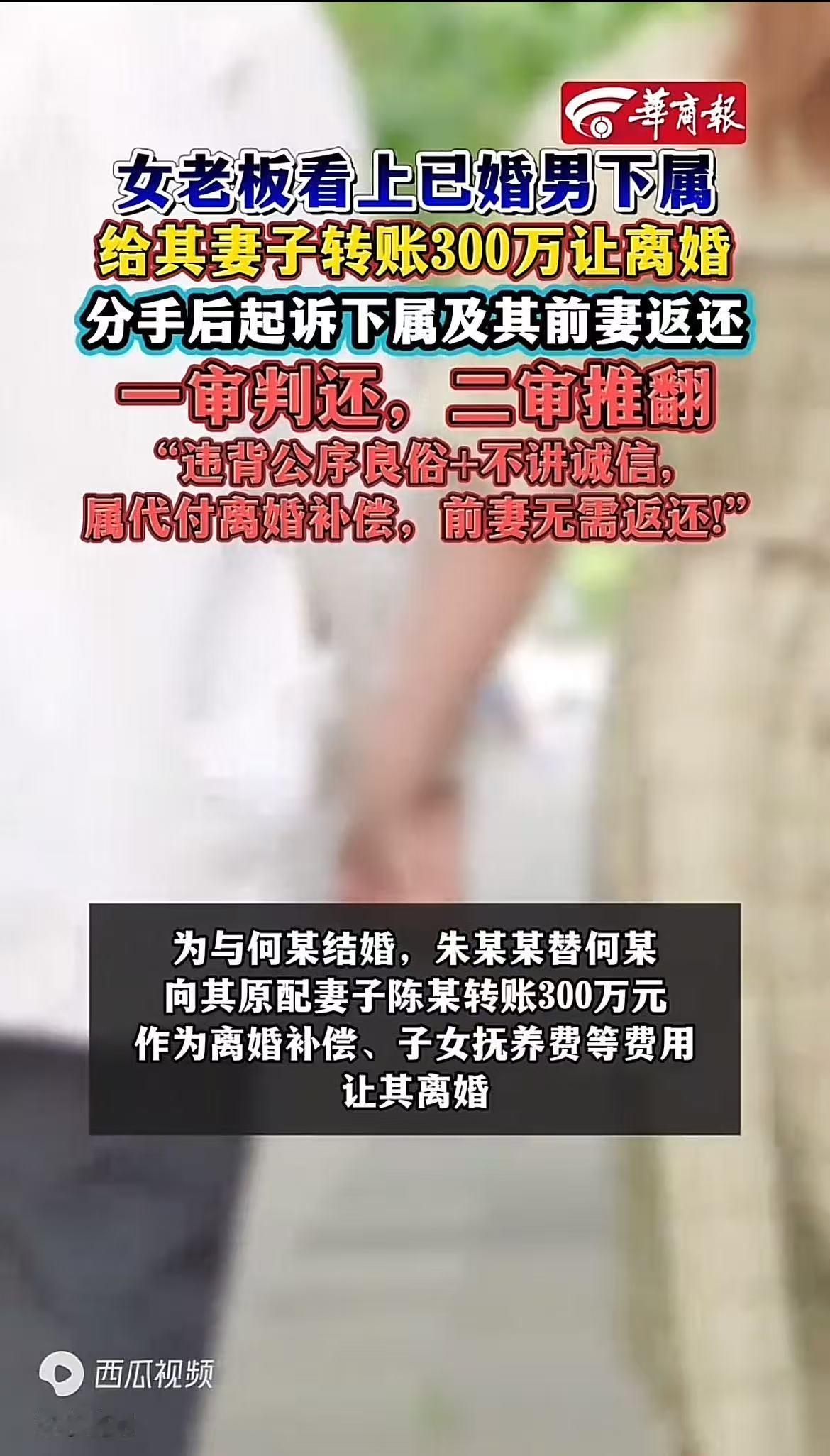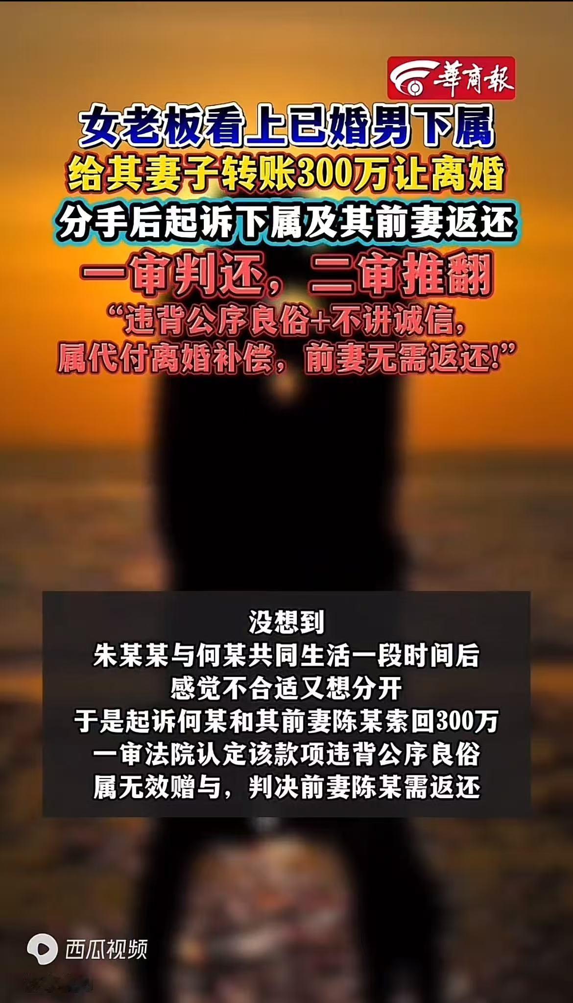 “电视剧都不敢这么演!”重庆,一女老板看上年轻男员工,两人发生了关系,女老板想让男子离婚,岂料,男子妻子得知后表示:只要女老板给她300万,她就和丈夫离婚!女老板痛快的给了钱,可谁知,她与男子仅同居1年后就分手了,于是将男子前妻告上法院,要求归还300万,法院判决 亲眼目睹自己挥霍300万巨资换取的“真爱”,仅仅维系了一年便分崩离析,她瞬间急了眼,一纸诉状将男下属的前妻推上被告席,狮子大开口要求对方全额退款。 然而,这桩案件背后的隐情远非表面那般单纯,最终的司法裁决更是让她始料未及,当头一棒。 乍一看,这位女老板似乎是在追讨失败的“投资”,声称这笔巨款是用于拆散他人家庭的违规支出,应当被认定为不当得利。究其根本,她不过是妄图借法律之剑为自己那场惨败的婚外恋挽回损失,这如意算盘打得确实响亮。 故事的源头,还得锁定在重庆那位名叫丽丽的女老板身上。身为上司,她一眼便相中了公司里年轻英俊的下属小明,随即便利用手中的职权,频频以“谈工作”为幌子制造独处机会。在这种频繁的接触下,两人很快突破了道德底线,发展成了实质性的越界关系。起初,小明心里多少有些忐忑,毕竟家中还有妻儿老小需要顾及。 怎奈女老板攻势太猛且出手极其豪横,最新款的智能手机、限量版名表那是毫不手软地相赠,小明很快便在物质的糖衣炮弹中迷失自我,索性连家都不回了。 尝到了甜头的丽丽并不满足于现状,她渴望的不再是见不得光的地下情,而是能够光明正大站在阳光下的名分。既然有了这般念头,她便径直找到了小明的原配妻子王女士,赤裸裸地逼迫对方离婚,好让自己成功上位。 出人意料的是,王女士表现得异常镇定,她深知一个心已飞走的男人,强留下来也毫无意义。经过一番深思熟虑,她直接开出了条件:"给我300万,我就同意离婚。"当时一心急着“转正”的女老板,几乎没有任何犹豫,便十分爽快地分两笔付清了这笔巨款。 资金到账后,王女士手握丈夫婚内出轨的确凿证据,顺利拿下了孩子的抚养权,并火速用这笔资金为女儿购置了一套学区房,以此开启了全新的人生篇章。反观女老板这边,日后的生活却远非她想象中那般顺遂。真正同居之后,她才惊觉两人根本是两个世界的人,无论是性格脾气、消费观念还是生活习惯,简直是格格不入。 昔日追求时的那种新鲜与激情早已烟消云散,取而代之的是无休止的争吵与冷战。仅仅过了一年,丽丽便对小明彻底丧失了兴趣,这段关系最终以分道扬镳告终。关系破裂后,女老板内心越琢磨越觉得憋屈,这笔账怎么算都亏得慌。毕竟是砸了整整300万真金白银才换来的一年所谓“爱情”,这桩买卖简直是血本无归。 起初她试图找小明追债,虽说小明心虚地立下了一张欠条,但双手一摊表示钱早已转给前妻,自己如今也是囊中羞涩。既然如此,丽丽索性一纸诉状将王女士告上了公堂,强硬要求对方返还这300万本金及相应利息。她的起诉理由相当冠冕堂皇:这笔钱是基于破坏他人婚姻目的支付的,严重违背公序良俗,因此王女士的获利属于不当得利。 令人意外的是,一审法院居然采信了这一观点,判决王女士必须退还这笔款项。王女士对此自然是一百个不服,她随即亮出了手中早已封存的铁证这些证据包括丽丽当初咄咄逼人催促她“开价”的录音,小明承认债务的欠条,以及双方白纸黑字明确该款项为“离婚补偿款”的协议。 二审法院在审视了这些关键证据链后,当庭做出了改判决定。法院的认定逻辑十分清晰:这300万绝非丽丽对王女士的无偿赠与,而是小明依据离婚协议理应支付给前妻的补偿金。其性质涵盖了子女的抚养费用以及对无过错方妻子的精神损害赔偿。在这场交易中,丽丽充其量只是帮小明“代付”了这笔债务,她与王女士之间根本不存在直接的法律关联。 说得直白点,女老板想要追回损失,冤有头债有主得去找小明,找王女士讨债纯属是拜错了庙门。 最终,法院作出判决,驳回女老板的所有诉讼请求。王女士不必退还分毫,此判决维护了她的合法权益,彰显了司法公正。这一终审结果曝光后,网络舆论瞬间炸开了锅。 有人慨然长叹:“此正所谓天道好轮回啊!”寥寥数语,道尽世事循环、因果不爽之理,令人心生感慨。破坏别人家庭还想反悔要钱,法院判得漂亮。"也有人理性分析:"金钱买不来真感情,更别想凌驾于婚姻道德之上。"其实静下心来细想,这场荒诞的闹剧中,根本不存在真正的赢家。 女老板因一时无法遏制的执念,不仅赔进去了300万巨款,更赔光了颜面。小明背叛了原本安稳的家庭,虽暂时逃避了债务压力,但早已声名狼藉,最终只得孤身一人远走异乡。唯有王女士,果断且及时地从错误的婚姻泥潭中抽身,用这笔补偿金为自己和女儿的未来筑牢了根基。 不过话说回来,她拿这笔钱完全是合理合法的。毕竟她才是婚姻里的无过错方,独自抚养女儿,这300万可以视为对她和孩子的合理补偿。 信息来源:汉水襄阳2025-9-12