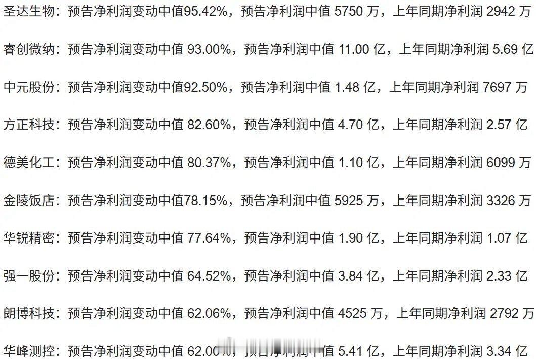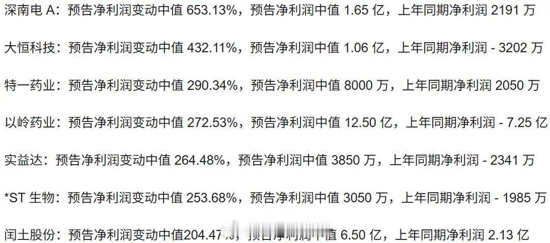 杜涛面相都变了 深夜传来一波利好!31家A股公司集中披露年报预增公告,量子科技、中药、芯片等领域的龙头企业集体发力,业绩翻倍的不在少数。先看净利润增幅超200%的7家公司,其中量子科技与机器视觉双龙头大恒科技表现尤为抢眼,年报预增中值达432%,预计净利润中值超1亿元——要知道去年公司还亏损3200万元,且此次增长主要由主营业务带动,水分较少,含金量十足。中药龙头以岭药业同样表现亮眼,同比大增272%,利润中值达12.5亿元。去年因计提大量到期药品减值、感冒药销量大降导致亏损7.25亿元,而今年销售端谷底反弹,业绩随之快速回升,周线股价也已显现走出低谷的态势。再看净利润增幅100%至200%的12家公司:模拟芯片龙头思瑞浦从去年亏损1.97亿元扭亏为盈,赚得1.75亿元,增幅接近200%,其产品在AI光模块、新能源、电网等领域的增长功不可没;军工及培育钻石龙头中兵红箭预增超100%,利润中值4000万元,要知道公司三季度还亏损近6000万元,意味着四季度单季利润约1亿元,反弹力度显著。净利润增幅50%至100%的10家公司里,光模块、PCB小龙头方正科技预增中值82%,利润均值4.7亿元,受益于人工智能、算力产业的蓬勃发展,业绩稳步上扬。最后是增幅小于50%的两家公司:捷昌驱动预告净利润变动中值47.50%,中值4.16亿元;存储芯片龙头兆易创新预增中值46%,利润中值16.10亿元,四季度单季盈利近6亿元,创近三年同期最佳,业绩持续恢复,有望借存储芯片涨价东风再上台阶。整体来看,这波预增覆盖多个热门赛道,龙头企业的业绩回暖为市场注入不少信心。