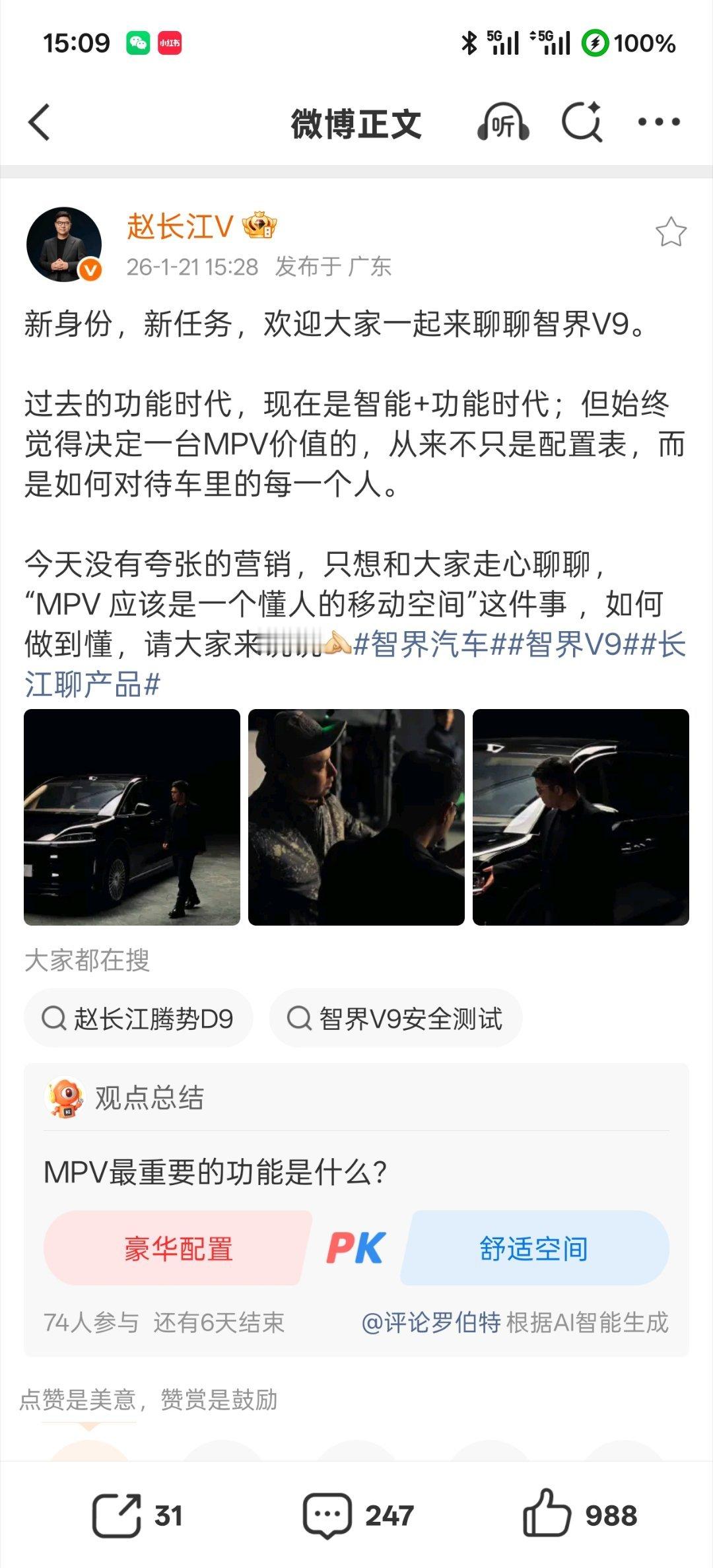 【智界赵长江称现在是智能 + 功能时代,决定一台 MPV 价值的是如何对待车里的每一个人】智界汽车执行董事及执行副总裁赵长江分享了自己对于 MPV 价值的看法,他表示,过去的功能时代,现在是智能 + 功能时代;但始终觉得决定一台 MPV 价值的,从来不只是配置表,而是如何对待车里的每一个人。本月早些时候,鸿蒙智行官方公布了旗下首款 MPV 车型 —— 智界 V9 新车的部分亮点信息。智界汽车智界V9长江聊产品