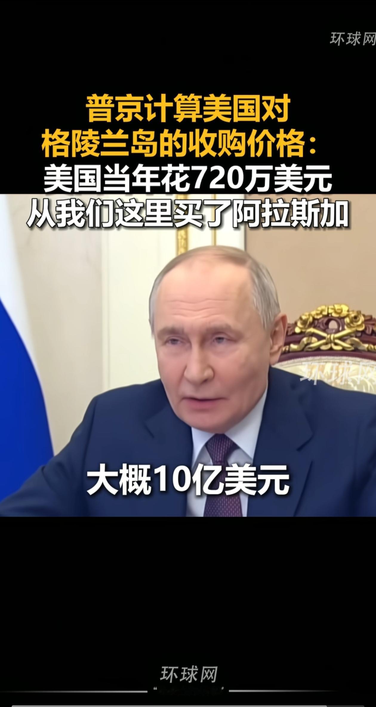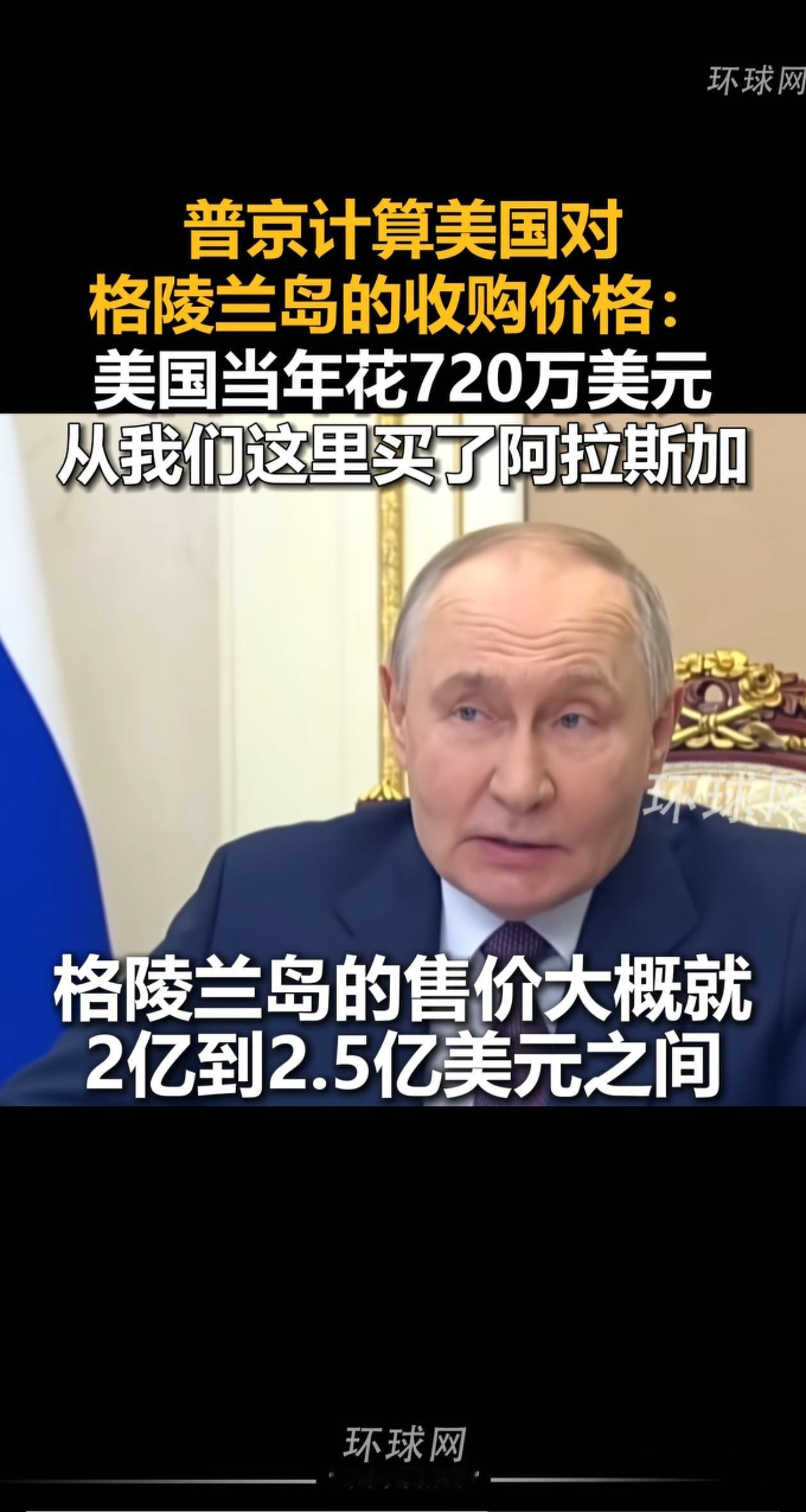普京帮美国估算格陵兰岛的价钱,参考当年美国购买沙俄阿拉斯加的情况,售价应在2亿到2.5亿美元,如果以黄金价格核算,那么大概应该在10亿美元。而加入特朗普的“和平委员会”要获得永久席位都需交纳10亿美元,这么看来,买岛的钱一点都不贵。