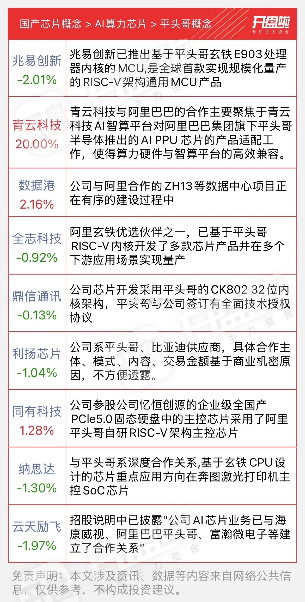 🚀阿里放大招!平头哥启动独立上市,这些A股伙伴要起飞?刚刚传来重磅消息:阿里巴巴集团决定支持旗下芯片公司平头哥启动独立上市计划!这不仅是国产AI算力芯片领域的里程碑事件,更直接引爆了整个平头哥概念股的想象空间。✨ 平头哥上市的深层信号• 技术突围:作为国内RISC-V架构的领军者,平头哥的玄铁系列芯片已在物联网、AI算力等领域实现规模化落地,此次上市将加速其技术迭代与商业化进程。• 生态爆发:随着上市融资到位,平头哥的“芯片开放平台”战略将进一步深化,与其深度绑定的A股伙伴们,也将迎来订单与技术的双重红利。🎯 重点关注A股伙伴1. 青云科技(20cm涨停):与平头哥AI PPU芯片深度适配,是智算平台核心伙伴,直接受益于AI算力硬件放量。2. 兆易创新:全球首款量产RISC-V架构MCU的厂商,基于玄铁E903内核的产品已打入消费电子、工业控制等场景。3. 全志科技:阿里玄铁优选伙伴,多款芯片已实现量产,下游覆盖智能硬件、汽车电子等高景气赛道。4. 纳思达:基于玄铁CPU研发奔图打印机主控芯片,国产替代逻辑清晰,有望借平头哥上市加速突破。📈 投资逻辑在国产替代与AI算力爆发的双重驱动下,平头哥的上市不仅是自身的资本跃升,更是整个RISC-V生态的价值重估。那些已实现技术落地、绑定核心供应链的上市公司,或将成为资金追逐的焦点。免责声明:本文仅为信息分享,不构成任何投资建议。