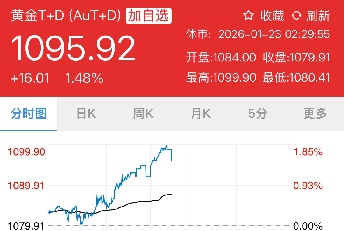 金价涨疯了[我想静静]黄金继续暴涨!今日国际金价直逼5000美元/盎司,国内基础金价1096元/克,今天是2026年1月23日,黄金一路高歌猛进,多次刷新历史记录,多个央行纷纷增持黄金。这次黄金上涨幅度和力度,再加上今日金价的行情,普通人已经拿不住它了。然而,面对紧张的美国伊朗局势、面对美元信用的不断崩塌,年底黄金价格,你觉得还会继续高涨嘛?