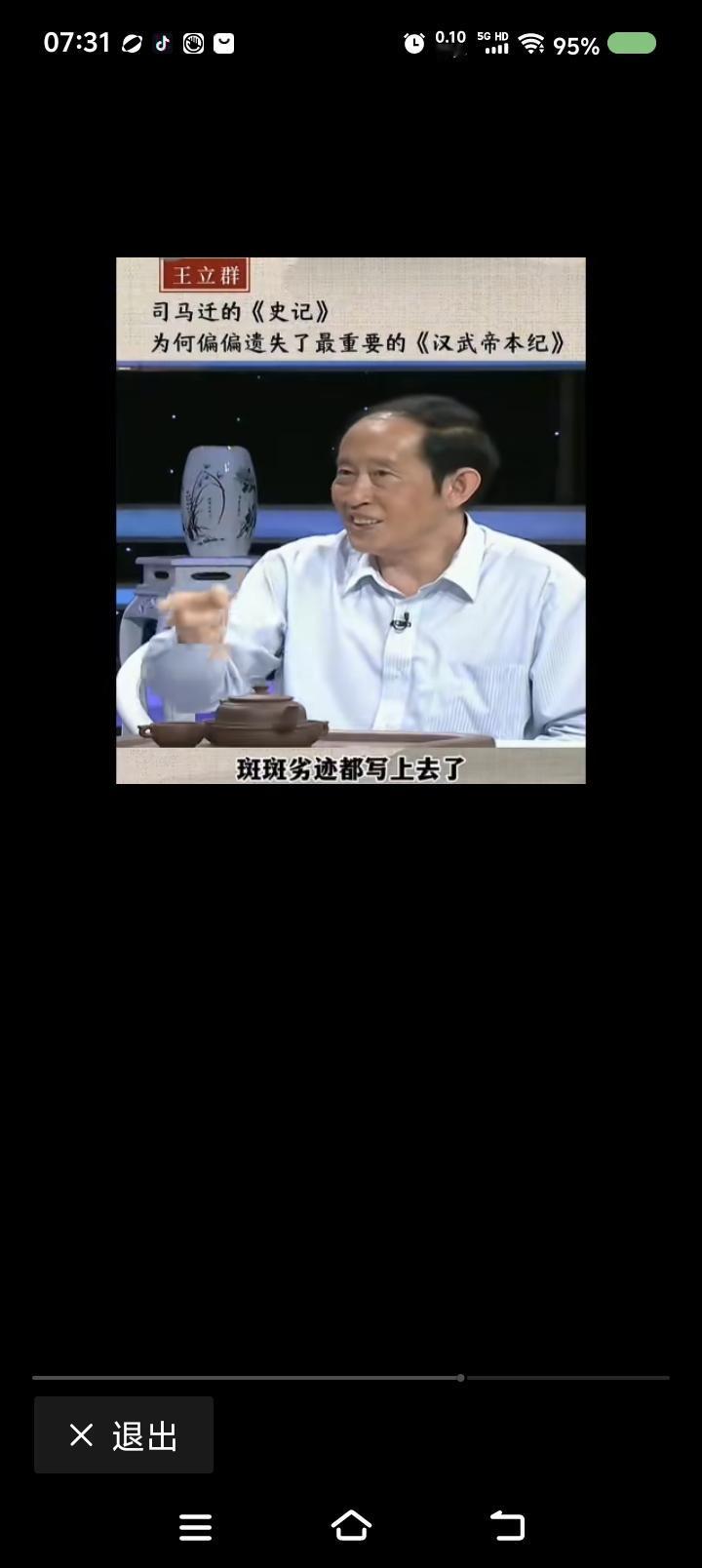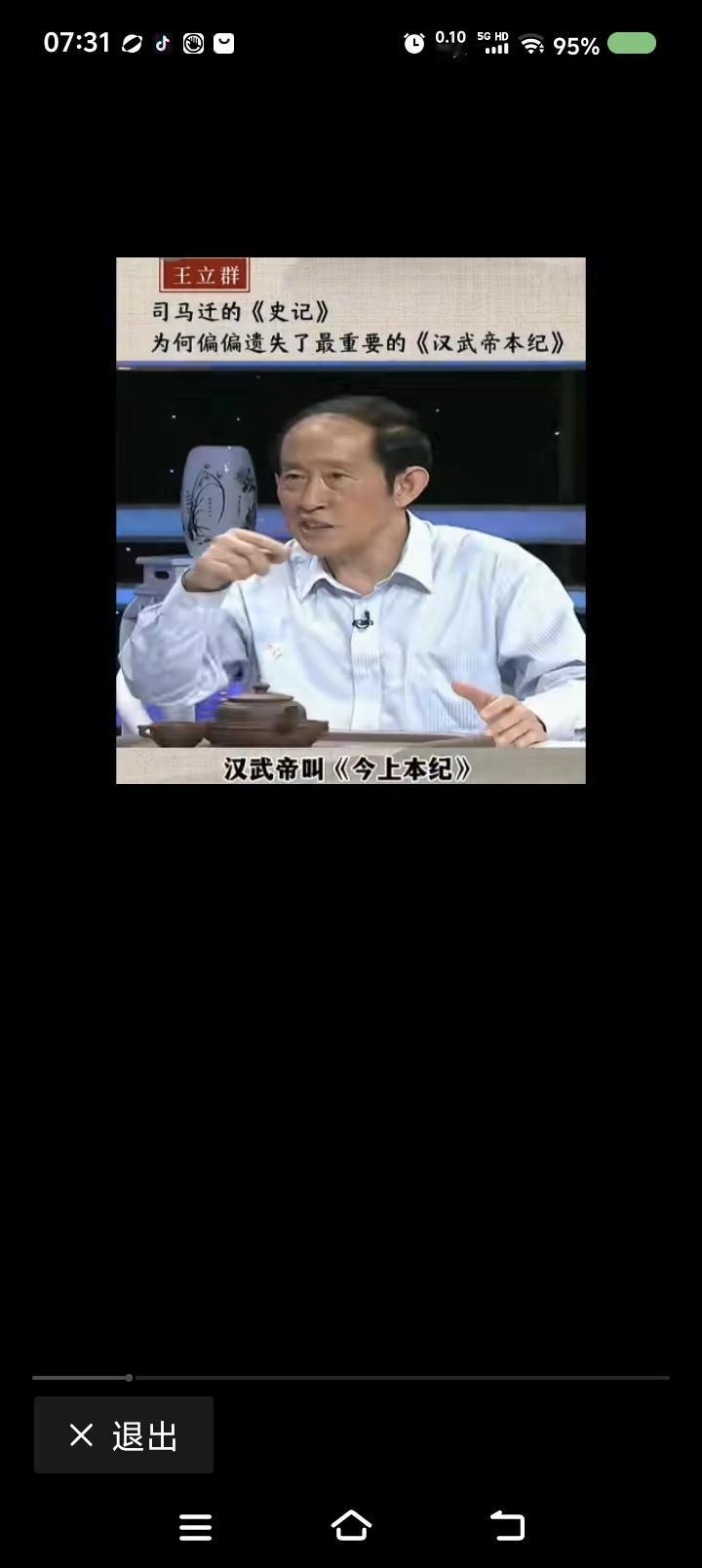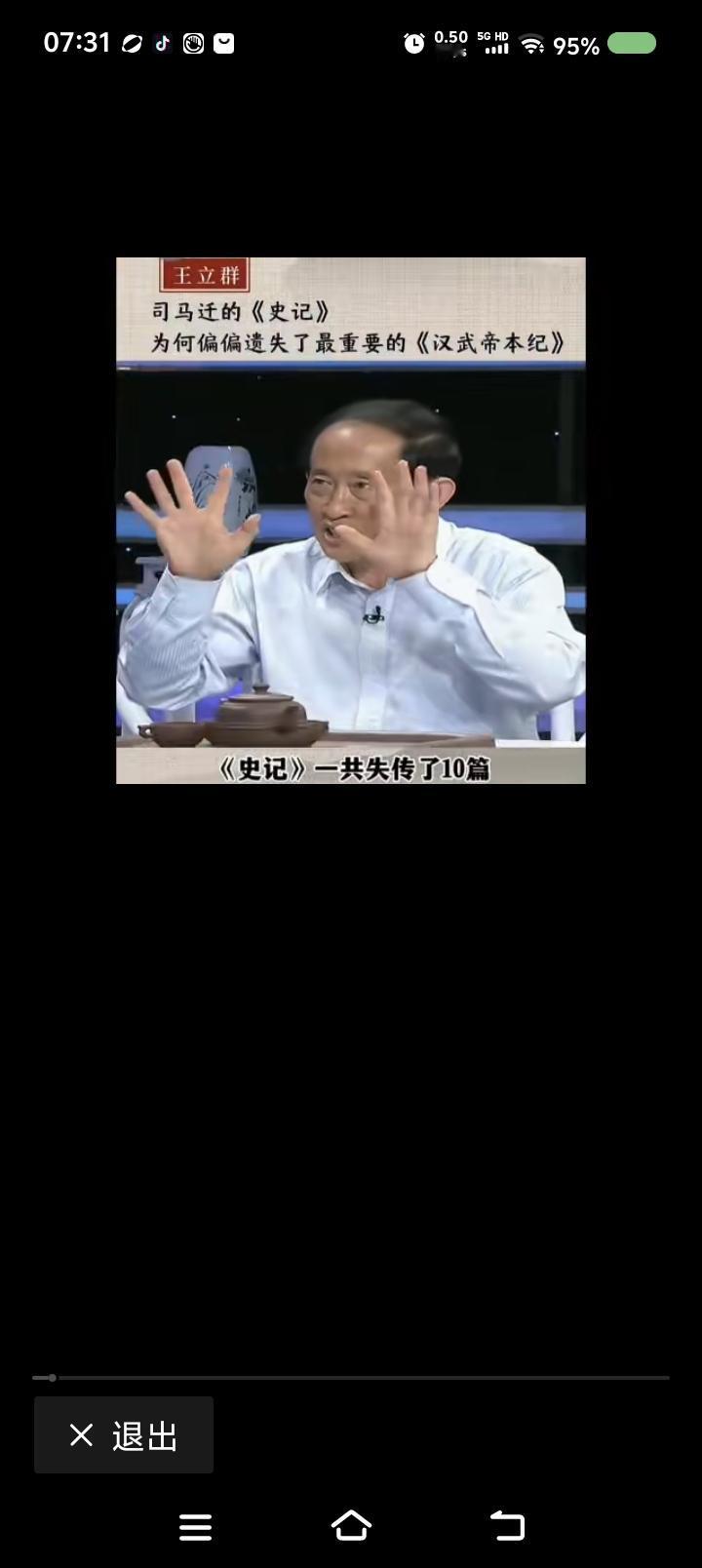 《史记》还有遗失的、后补的?—— 节目里,王立群教授说《史记》有10篇失传了,其中最有名的是《今上本纪》,即汉武帝的本纪。怎么回事,不言而喻。现在看到的,是从《史记》的封禅书掐了一段移来的。 点评: 打个电话给汉武帝,问问他咋想的。 另外,别补了。宁要残缺的美,不要历史的缝缝补补。