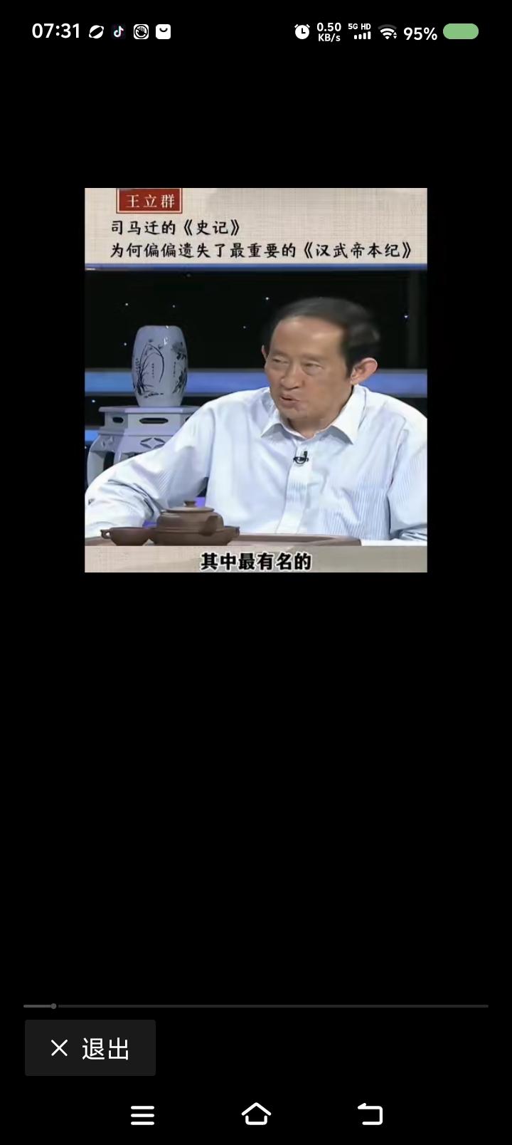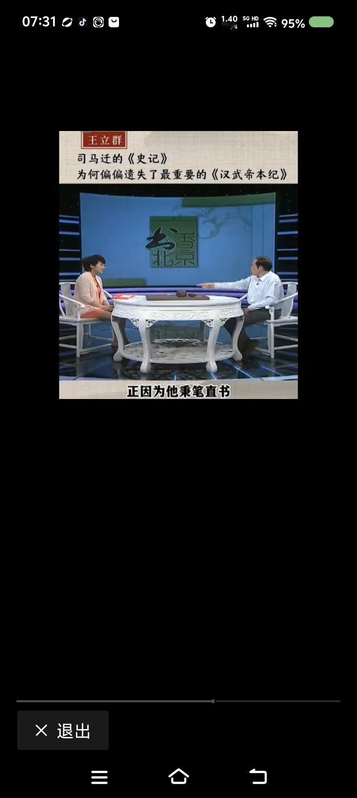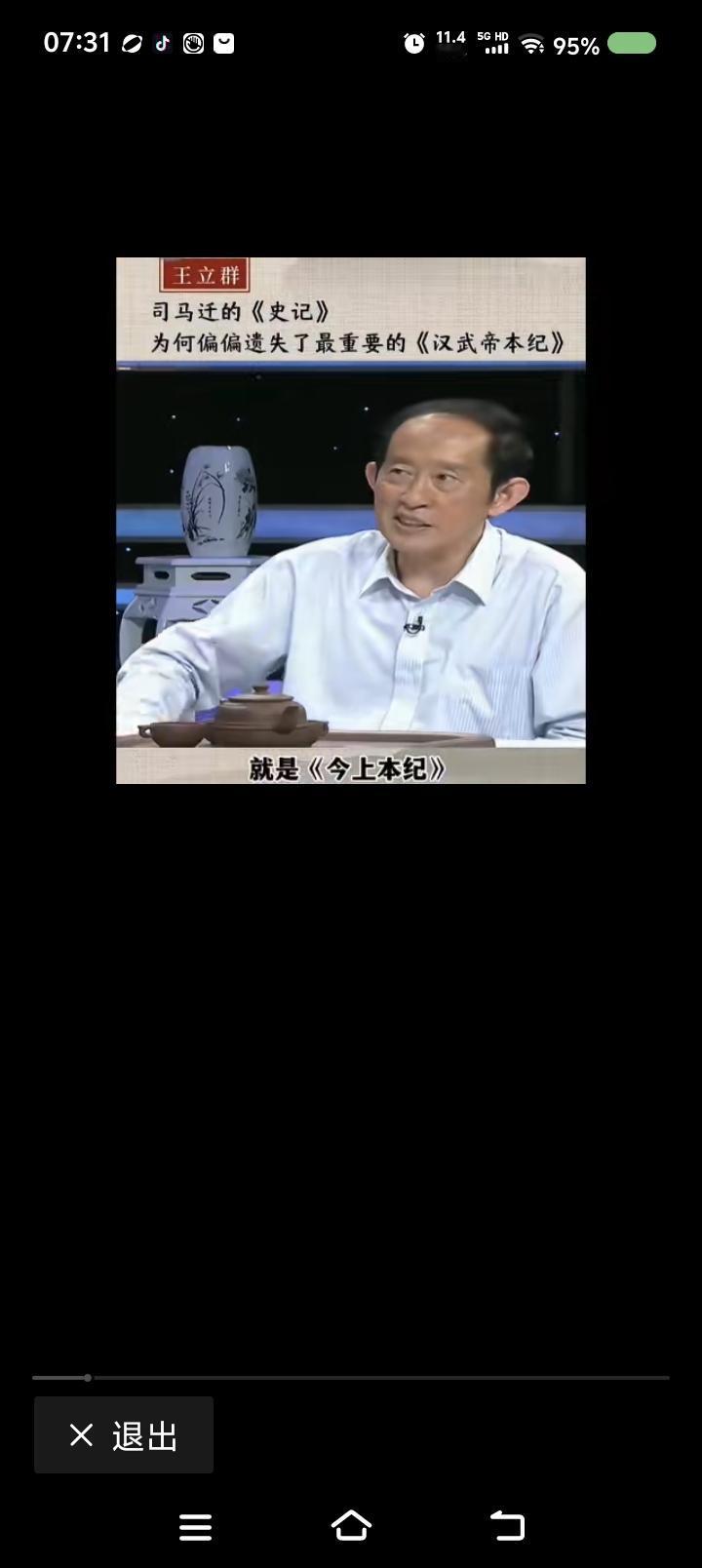 《史记》还有遗失的、后补的?—— 节目里,王立群教授说《史记》有10篇失传了,其中最有名的是《今上本纪》,即汉武帝的本纪。怎么回事,不言而喻。现在看到的,是从《史记》的封禅书掐了一段移来的。 点评: 打个电话给汉武帝,问问他咋想的。 另外,别补了。宁要残缺的美,不要历史的缝缝补补。