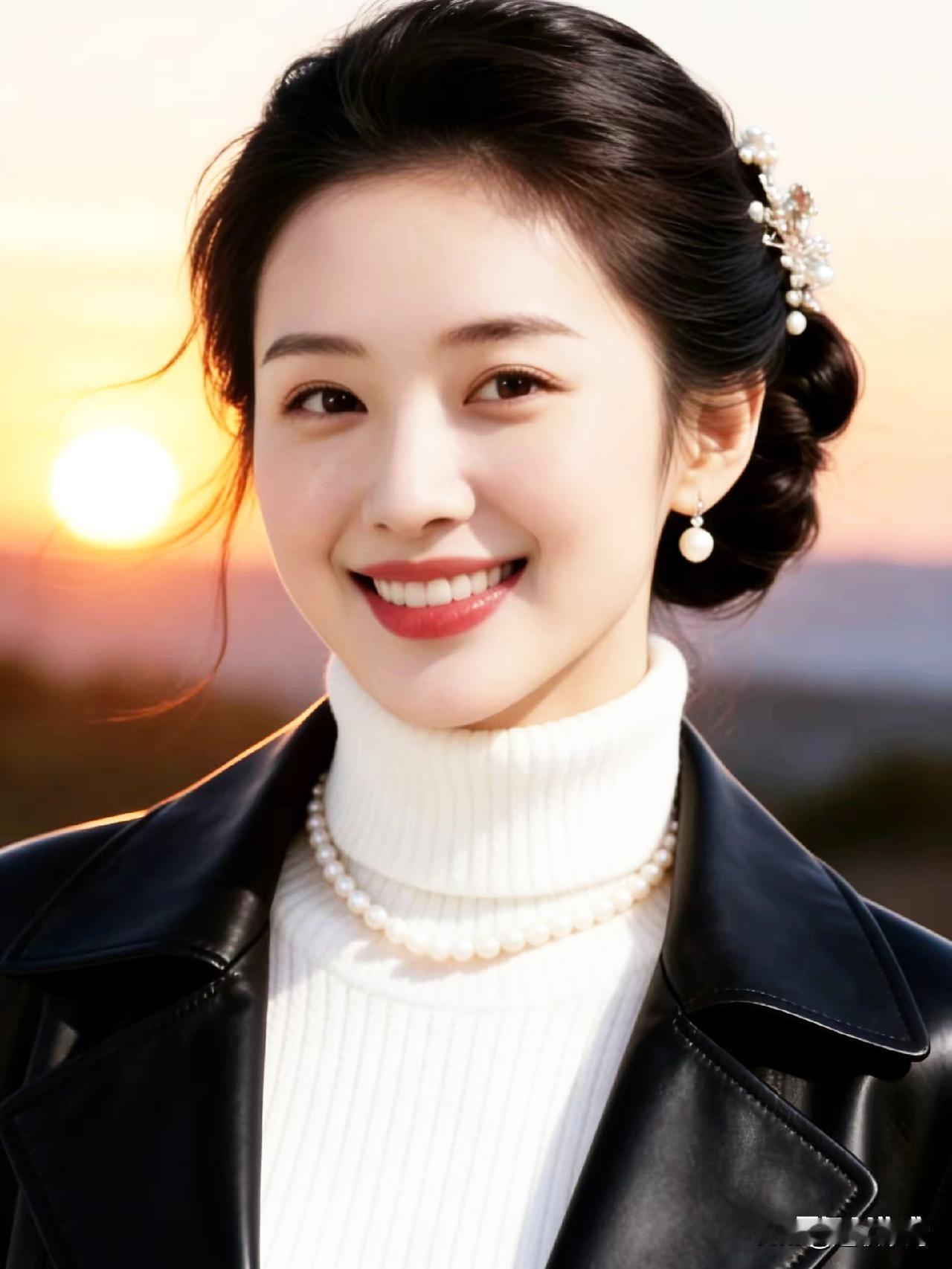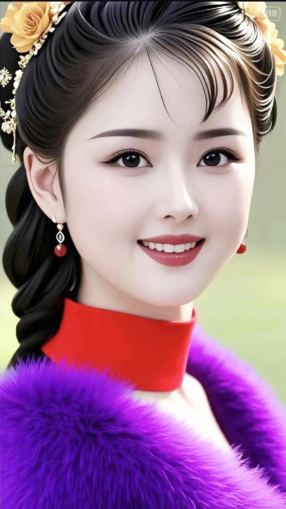 惊艳的古典美人,红衣紫裘,花饰点缀,宛如画中仙子。
