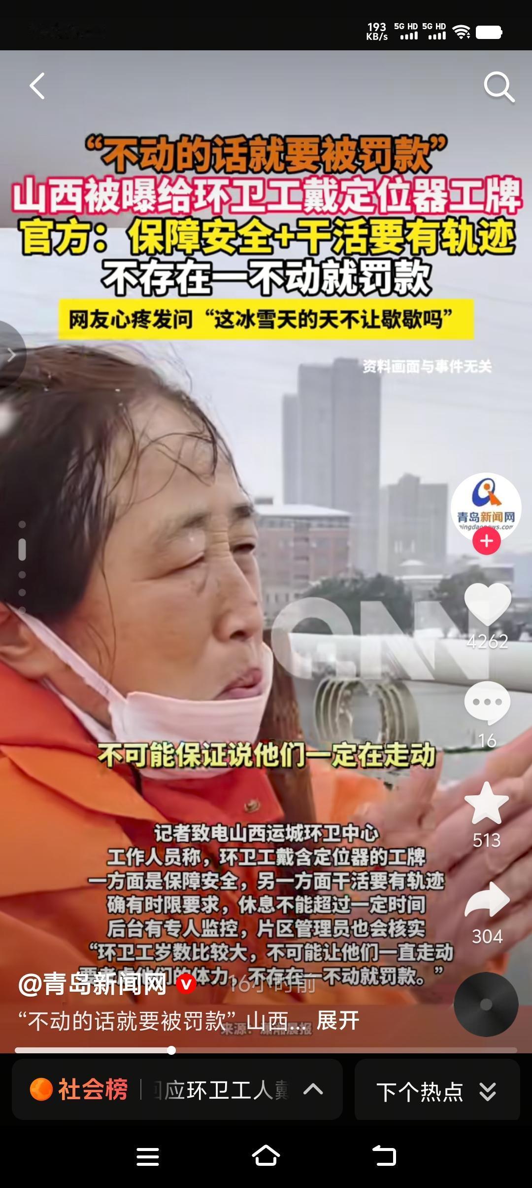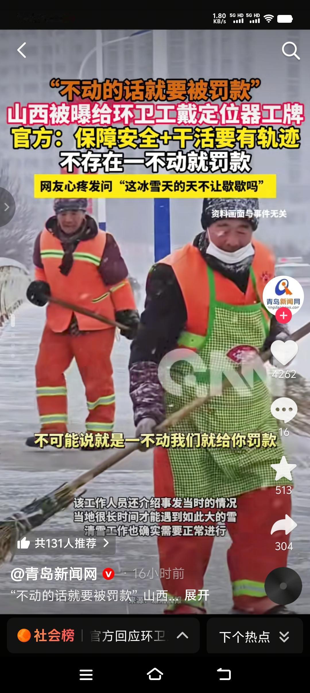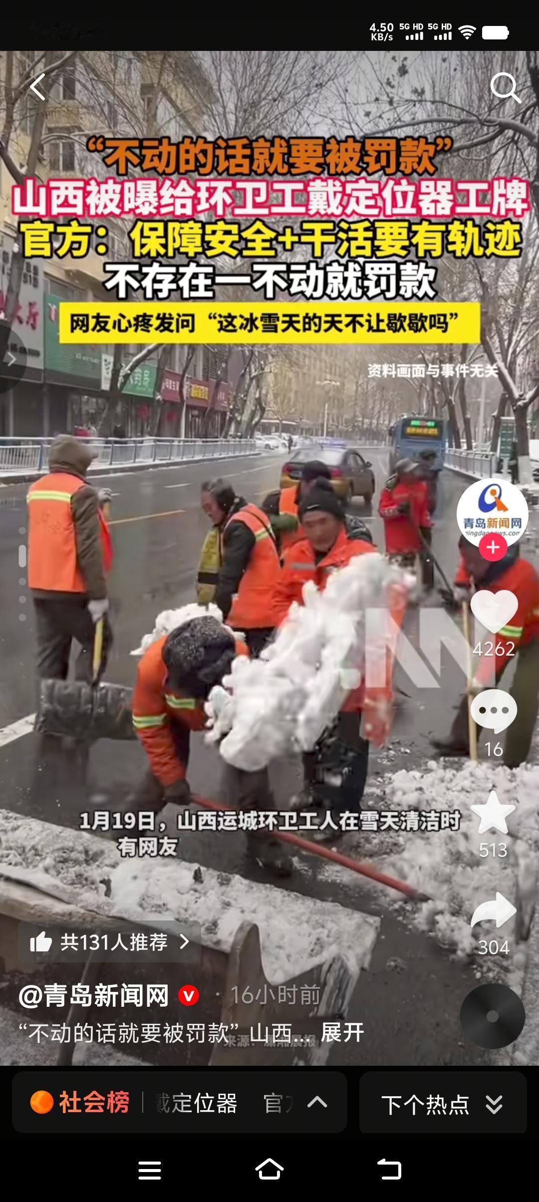 环卫工最底层的劳动者,却戴着最科技的仪器。山西运城环卫工人佩戴着定位器工牌,美名其曰“保障安全,为的是干活有轨迹,后台能看到监控”。 清雪当天给环卫工佩戴定位器工牌到底是为了什么?相信大家都心知肚明。环卫工又叫“城市美容师”,干着最脏最累的活儿,拿着几乎是每个城市的最低工资。风吹日晒,起早贪黑,每天都有他们的身影。如果真的关心他们,难道非要戴定位器吗?