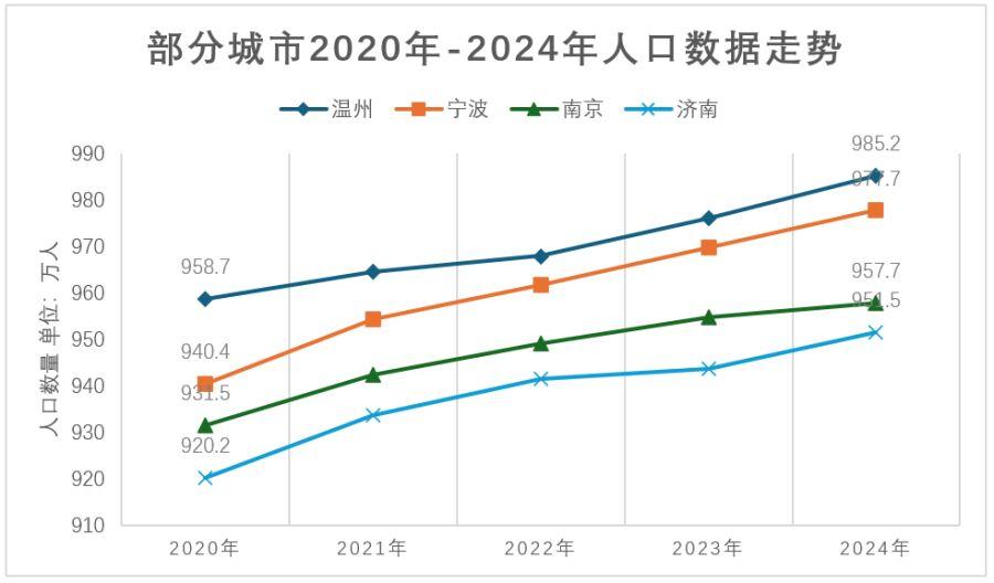 合肥成了我国第18个常住人口破千万的城市后,下一个千万人口城市备受关注。目前全国常住人口在900万 - 1000万的城市有13个,其中超950万的有6个,分别是哈尔滨、温州、宁波、佛山、南京和济南。 从数据看,温州最有戏。2024年温州常住人口达985.2万人,距“千万级”仅差14.8万人,且2023年人口增量8.2万人,2024年达9.1万人。随着城镇化推进,未来十年近1亿人进城,谁能抓住机会吸纳人口,谁就可能成为下一个千万人口城市。