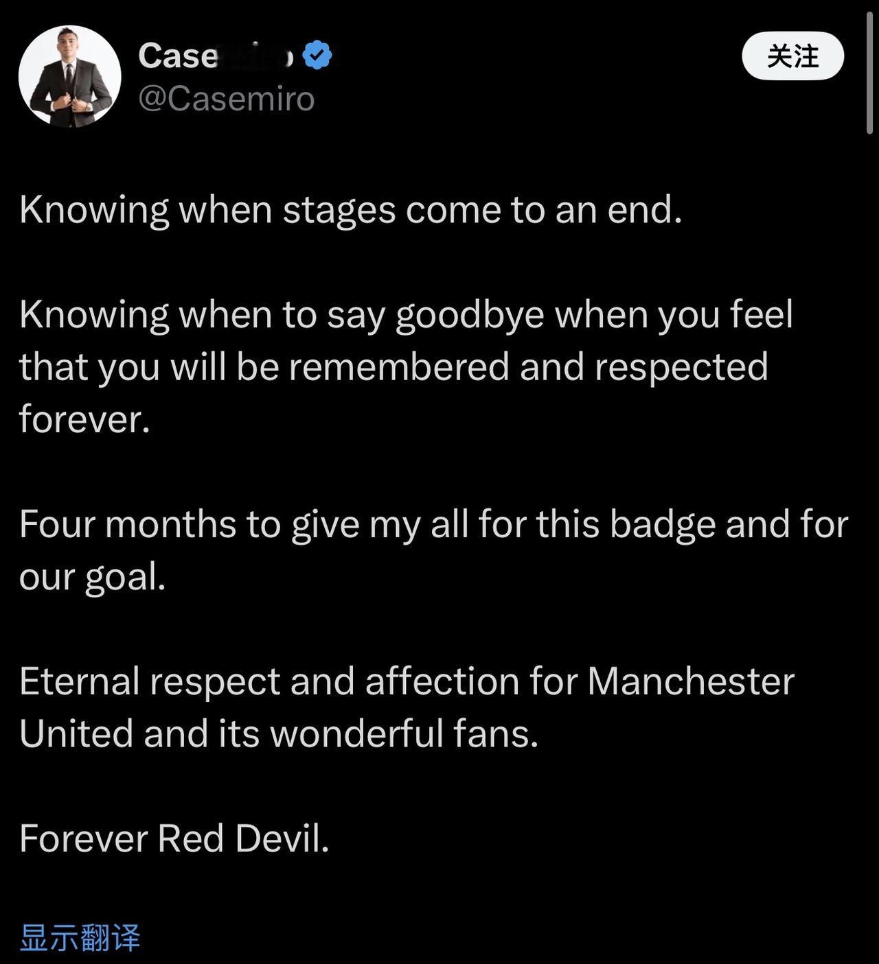 卡塞米罗写给曼联球迷的话: 🔴知道各个阶段何时结束。 🔴懂得何时说再见,因为你觉得自己会被永远铭记和尊敬。 🔴我用了四个月的时间全力以赴,为了这个徽章,也为我们的目标而努力。 🔴对曼联及其可爱的球迷们,永远怀有敬意和热爱。 永远的红魔。