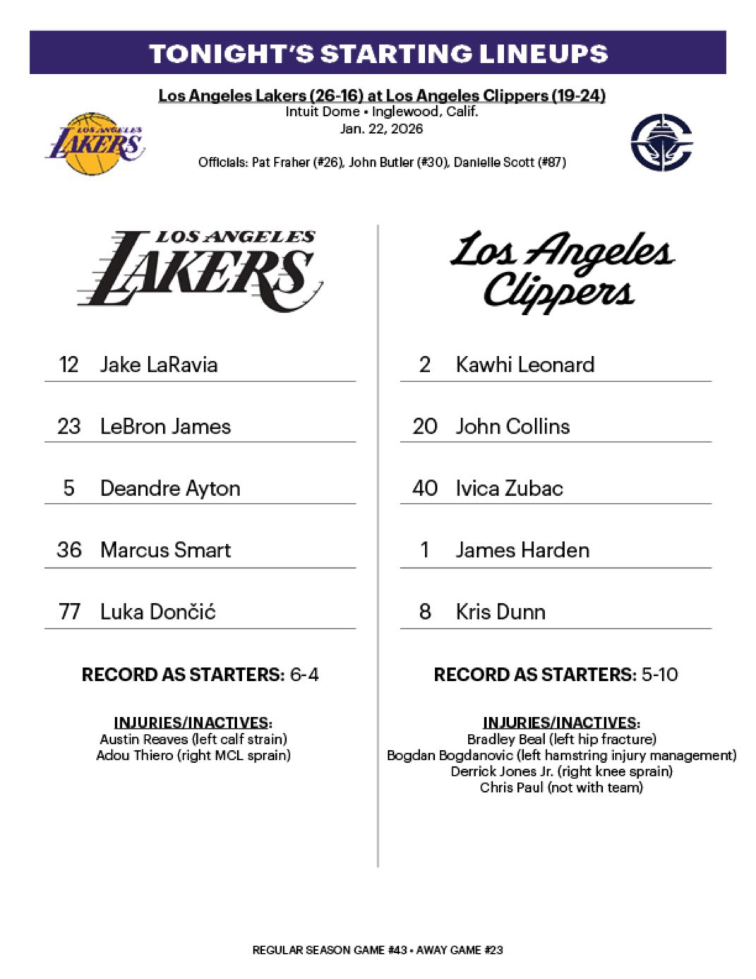 本赛季洛杉矶德比第三回合首发出炉,湖人仍需提防裁判搞事。