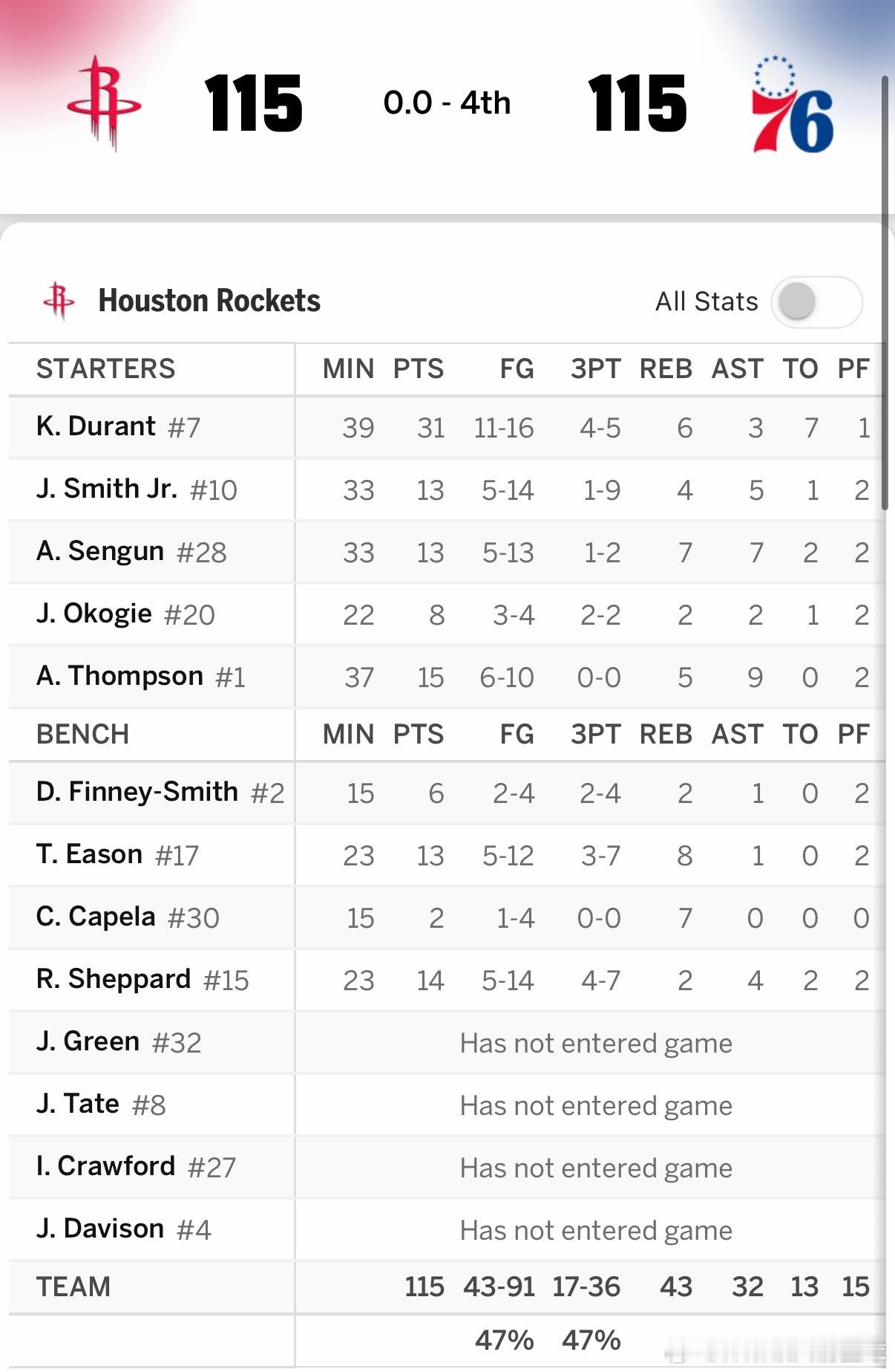 休斯顿火箭 NBA球员评分 杜兰特-我的评分:凯文·杜兰特今天数据:▪️36分▪