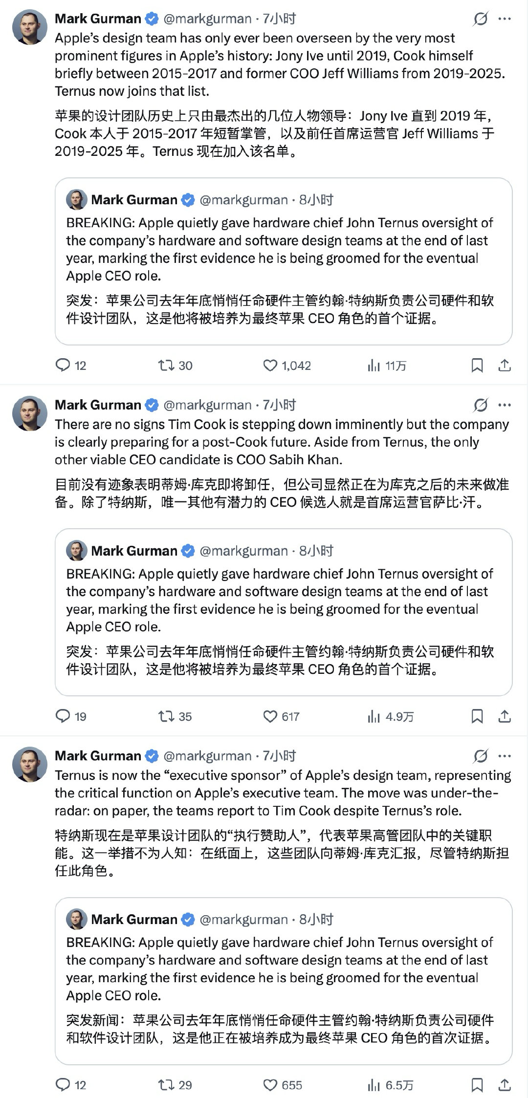 好久不发声的 Mark Gurman 连发数条推,John Ternus 离苹果 CEO 的位置越来越近了~