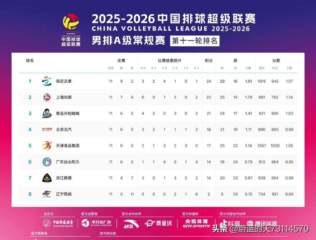 [男排各队的实力变化及影响因素] 第十五届全运会男排正赛,河北男排位列第七,天津男排位居第九(见截图一),然而时隔短短的几个月,河北男排、天津男排判若两队, 一跃升至联赛A级赛暂排第一 和第五名,大有夺冠和站上领奖台之趋势。那么问题来了,河北男排和天津男排为什么在联赛成绩会有大幅度的跃升?是赛制的问题?还是没有外面的人进来则显弱,有外面的人进来则显强呢? 从全运会排名和联赛A级赛双循环前十一场比赛看,全运会前六名分别是山东、福建、上海、浙江、北京和江苏。 联赛A级赛止十一轮前六名分别是河北、上海、山东、北京、天津和广东(其中:河北、上海、天津为引援队,山东、北京、广东等为全华班队)。 由此看来,不管何种赛事,真正实力雄厚,表现稳定的队是山东、上海和北京队,全运不行而联赛靠多名外援大幅度提升联赛成绩的是河北和天津队,而浙江男排则由于主力主攻张景胤、王滨因伤未赛,主力副攻李咏瑧留洋打球,在联赛A级赛中战绩不佳。 说明:各队成绩与赛事有关,与各队引不引援有关,与各队的目标定位有关,与伤病等原因有关。 男排排超联赛 排球联赛积分榜