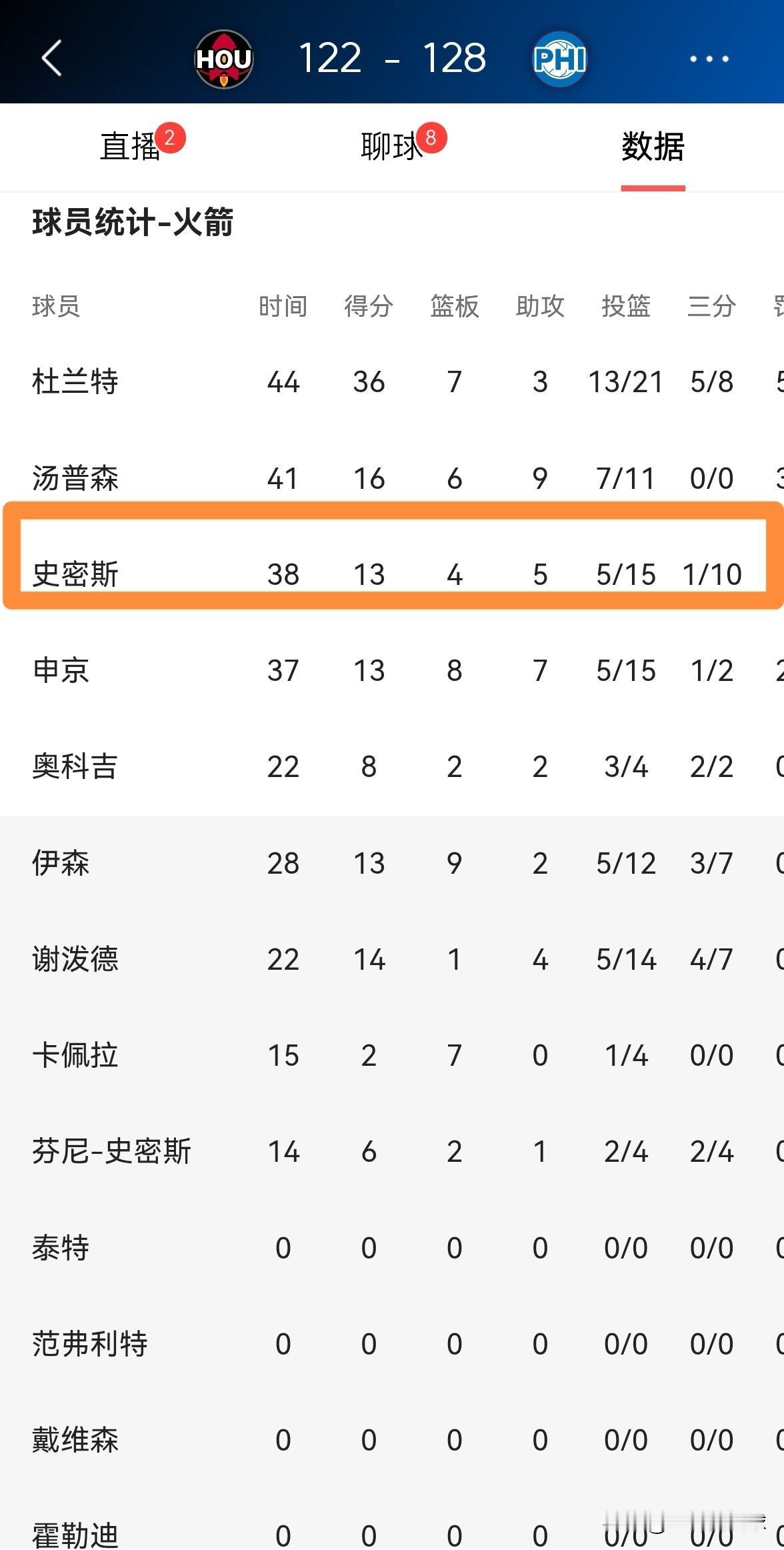 我真是太佩服火箭大将小史密斯对于三分球的执着了!在今天火箭客场以122:128输给76人的比赛中,小史密斯再次在三分线外失准,他在首发出战的38分钟里,投篮15中5,其中三分球10中1、罚球2中2非常低效的得到13分,他的场上正负值为-13。 我最佩服小史密斯的地方在于,他在三分手感非常冰凉的情况下依然执着于出手三分,这份勇气和执着真是令人钦佩。