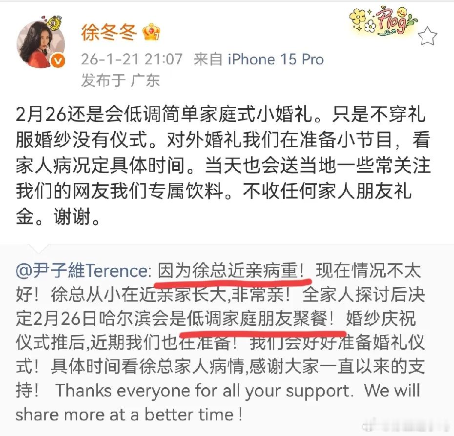徐冬冬和尹子维的婚礼推迟了,不办仪式了,就家里人和朋友一起吃顿饭意思意思。说真的,徐冬冬这姑娘还挺重情义的。她在评论区回网友说,大伯病重成植物人了,作为侄女,哪还有心思搞什么隆重的仪式啊。之前她还说想办个特别的流水席婚礼,现在就家里人简单聚聚,其实也挺好的。