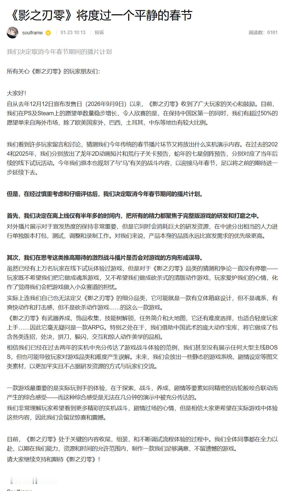 《影之刃零》取消了今年春节期间的播片计划,理由是本作的开发工作正处于关键收尾阶段,团队希望能集中所有资源来研发和打磨完整版游戏。影之刃零取消春节播片