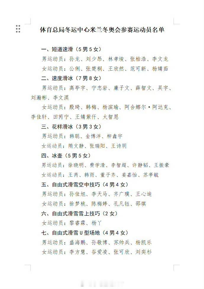 米兰冬奥运动员公示国家体育总局冬季运动管理中心在官网公示参加2026米兰冬奥会的运动员名单,共124人参赛。苏翊鸣、徐梦桃、谷爱凌、林孝埈、隋文静/韩聪等运动员在列,短道速滑归化选手刘少林落选。谷爱凌苏翊鸣徐梦桃将参加米兰冬奥刘少林落选体坛风云