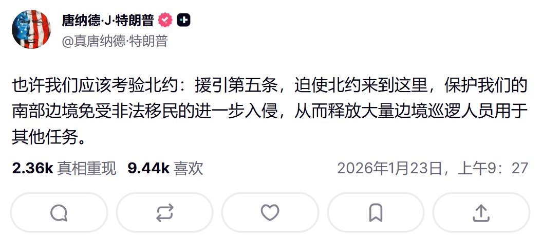 特朗普表示,应该援引北约第5条,让北约派兵帮助美国应对非法移民,而让美国的边境巡逻人员从事其他任务。➤让美国的边境巡逻人员从事其他什么任务?总统亲卫军吗?热点观点烽火问鼎计划