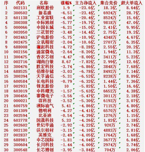 1月23日上午盘,主力趁低位,大幅买入的30名单 金风科技:涨幅 +10.00%(涨停),净流入 15.8亿元 航天电子:涨幅 +10.00%(涨停),净流入 14.9亿元 隆基绿能:涨幅 +7.79%,净流入 12.6亿元 蓝思科技:涨幅 +7.93%,净流入 8.81亿元 烽火通信:涨幅 +9.99%(涨停),净流入 7.96亿元 1月23日中午收盘,主力资金“大幅卖出”的30名单: 利欧股份:涨幅 +1.90%,净流出 23.6亿元 新易盛:跌幅 -6.51%,净流出 23.4亿元 工业富联:跌幅 -4.08%,净流出 20.4亿元 中际旭创:跌幅 -5.77%,净流出 19.7亿元 中国长城:跌幅 -6.21%,净流出 15.0亿元