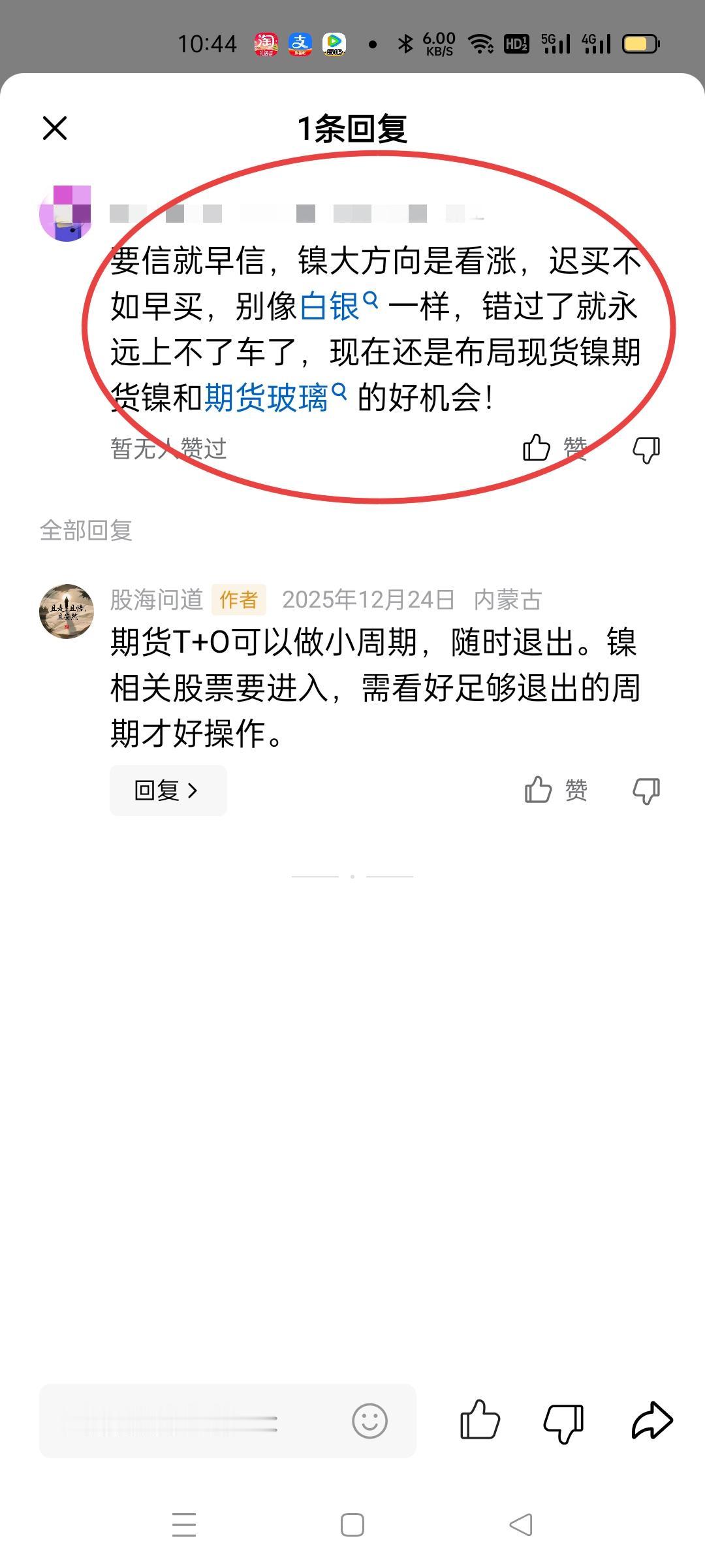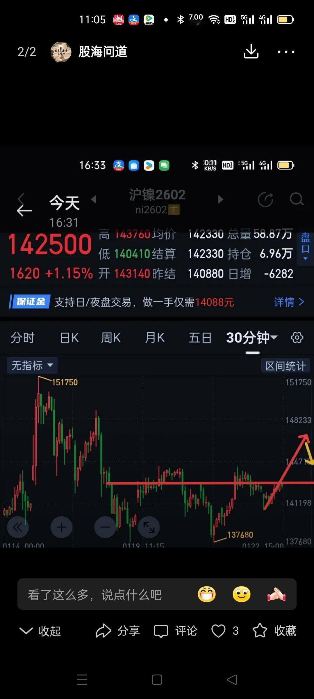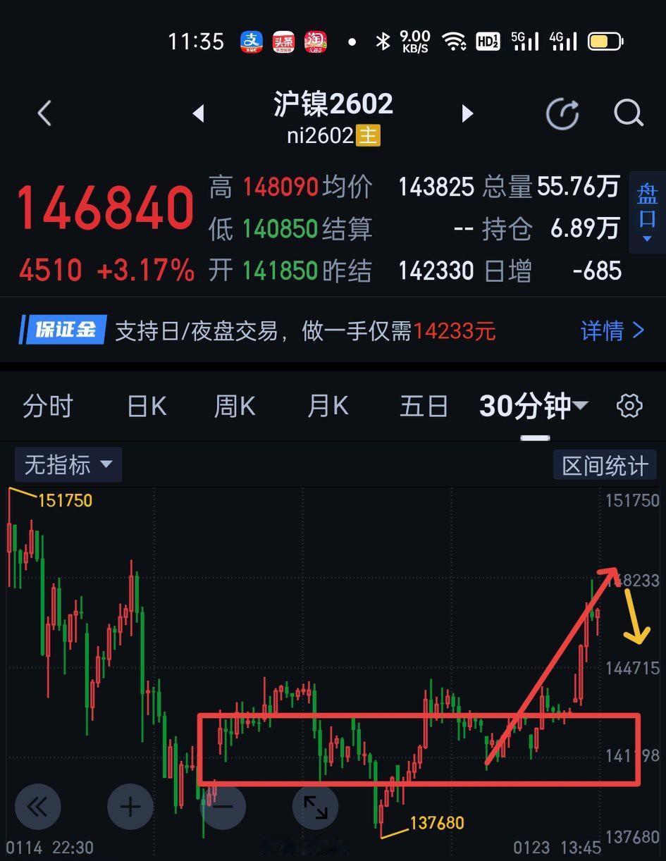 沪镍2602,五分钟上继续逼空。开始于140410的三十分钟一笔上还在生长中,如手握多单,设好止盈,只要五分钟一笔下不进入143810,后市还可以谨慎跟随上涨,直至三十分钟一笔上完成。如果错过了这里的上涨,目前最好的节奏就是如昨天文章说的耐心等待三十分钟的回调,观察是否形成五分钟中枢的三买。下午想抓五分钟一笔下结束一定要设好止损,要反思当下的三十分钟一笔上在次级别上错过了几次机会?现在都要在次级别上找三十分钟上的结束点了,如果现在入手多单,风险大于机会。再次感谢自12月24日我开始解读沪镍跟随我的粉丝,如果这个过程有所收获,有时间可以再读前面沪镍的解盘文章,还会大有裨益的,不是炫耀,是让大家感受缠论的魅力,激发学习兴趣,提高认知纬度。与其临渊羡鱼,不如退而结网。12月24日的文章原本想一带而过的,是图〈3〉网友激发了我继续解析的兴趣。感谢这位网友让这件事有了缘起,感谢各位粉丝的耐心陪伴。