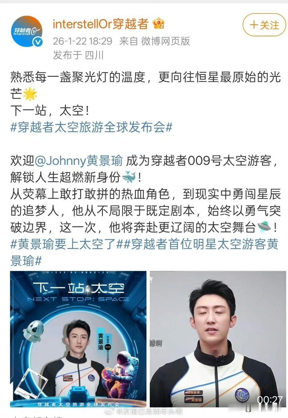 内娱卷到太空!黄景瑜成中国首批商业太空游客 1月22日,黄景瑜官宣成为国内首艘商业载人飞船“穿越者壹号”009号太空游客,将于2028年开启亚轨道飞行,这波跨界直接引爆全网!他也成为首批20余位游客中唯一的明星代表,其荧幕硬汉形象与太空探索精神高度契合,官方直言他能带动更多人关注航天科技。 此次飞行并非噱头,飞船将穿越100公里卡门线,让乘客体验5分钟左右失重并俯瞰地球全景,且“云感着陆”系统为飞行筑牢安全防线。更值得关注的是,中国商业太空旅游已告别富豪专属,亚轨道票价降至150-300万元,18-75岁健康人群仅需几天基础训练即可报名。 从荧幕军人到太空旅客,黄景瑜的跨界让网友直呼“内娱卷到宇宙了”。而随着国产商业航天的发展,普通人的星海梦,正一步步照进现实,静待2028年黄景瑜的太空见闻!黄景瑜上 太空 内娱卷上天