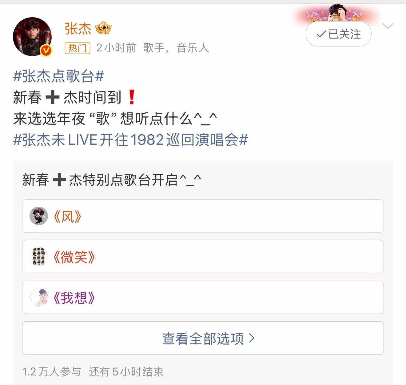 张杰点歌台张杰:新春➕杰时间到❗️来选选年夜“歌”想听点什么^_^~张杰成都演唱会今晚开唱