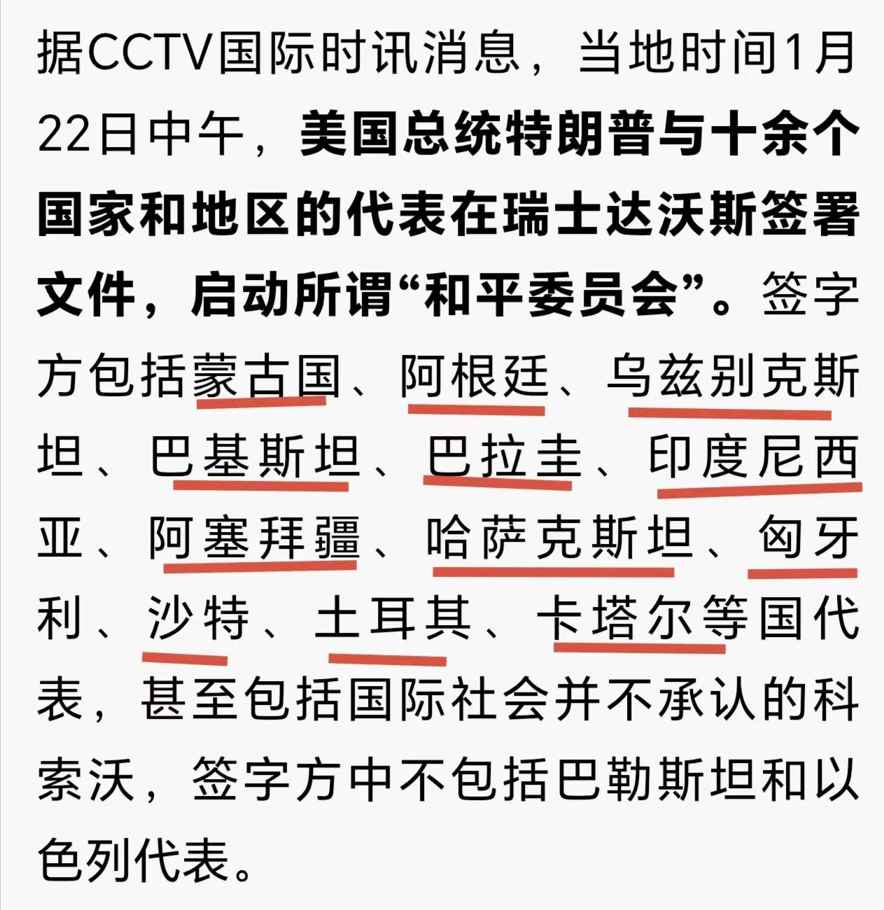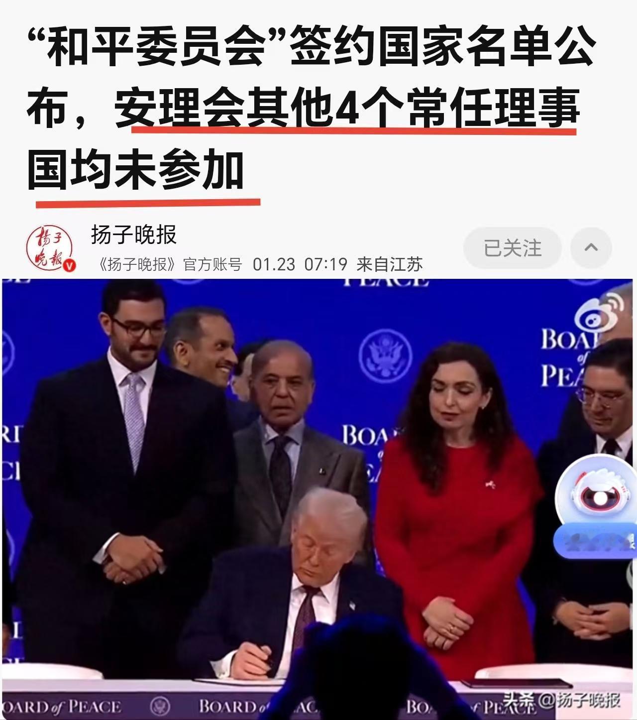 特朗普筹建的所谓“和平委员会”,不过是个拉帮结派的小团体。 特朗普自封为大哥,他一人就拥有生杀予夺的否决权, 换句话说,那些势单力薄的小国,谁不听话谁可能就是下一个委内瑞拉的马杜罗。 看看那些首先签字的国家,就知道他们是恐惧大于兴奋,忐忑大于激动, 而大凡有头有脸的国家大多不会趋炎附势,把热脸贴在特朗普的冷屁股上,恣意地被这个疯老头子拿捏!