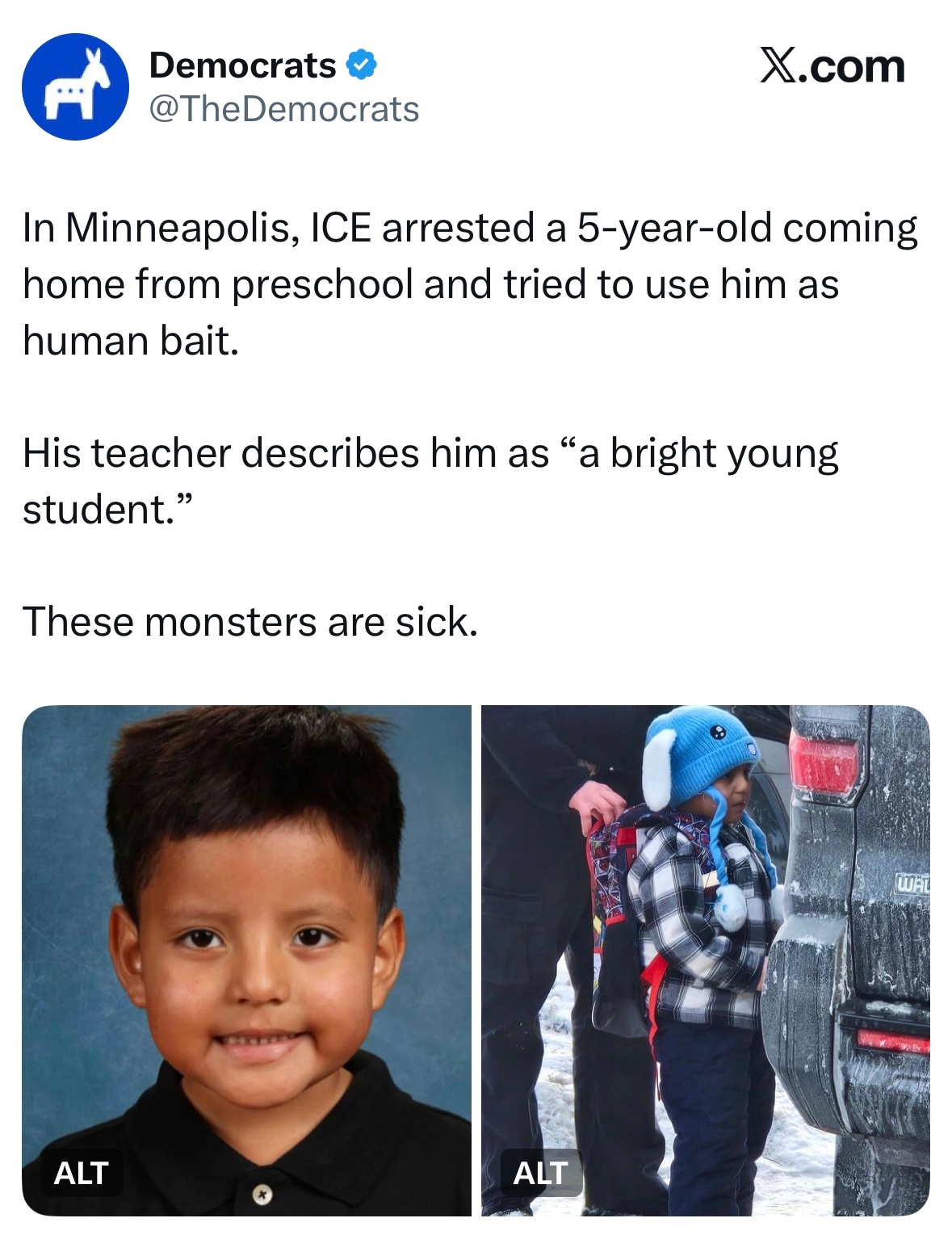 美国民主党官方账号公然撒谎,污蔑ICE在明尼阿波利斯“逮捕”了一名五岁小男孩。而