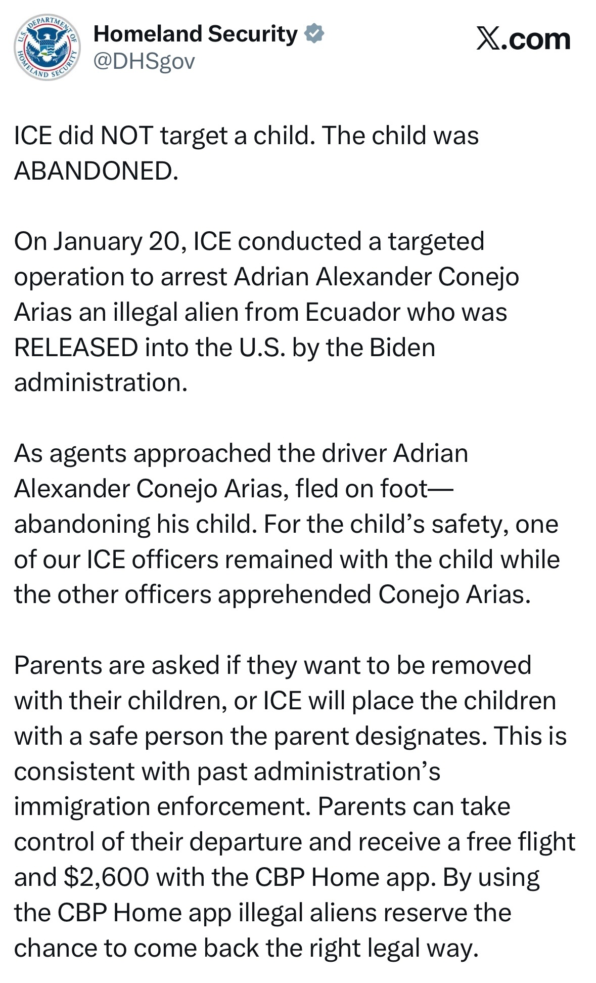 美国民主党官方账号公然撒谎,污蔑ICE在明尼阿波利斯“逮捕”了一名五岁小男孩。而美国国土安全部澄清事实,ICE没有逮捕小孩反而救助了他,因为他的非法移民毒品抛弃他逃跑了。美国国土安全部说:ICE没有针对儿童。孩子是被遗弃的。1月20日,ICE开展了一次有针对性的行动,逮捕厄瓜多尔籍非法移民阿德里安·亚历山大·科内霍·阿里亚斯。此人此前被拜登政府放入美国。执法人员接近时,驾车者阿德里安·亚历山大·科内霍·阿里亚斯弃车逃跑,徒步逃离,丢下了自己的孩子。为保障孩子安全,一名ICE警员留下照看孩子,其他警员则将科内霍·阿里亚斯抓获。ICE会询问父母是否愿意与孩子一起被遣返;如果不愿意,ICE将按照父母指定,把孩子交给一名安全的看护人。这与以往各届政府的移民执法做法一致。父母也可以自行决定离境安排,通过CBP Home应用获得免费机票和2600美元补助。使用CBP Home应用,非法移民可以保留日后以合法方式再次入境的机会。热点现场海外新鲜事