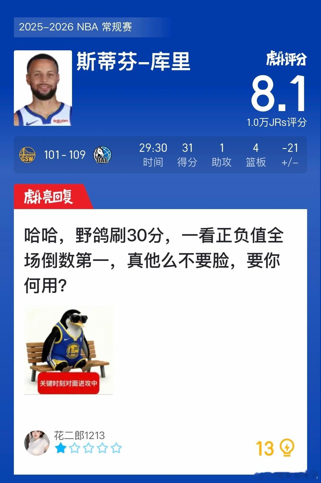 哈哈哈半场结束,我库正负值又-18了,库明加+18。越来越喜欢看库里了。勇士vs
