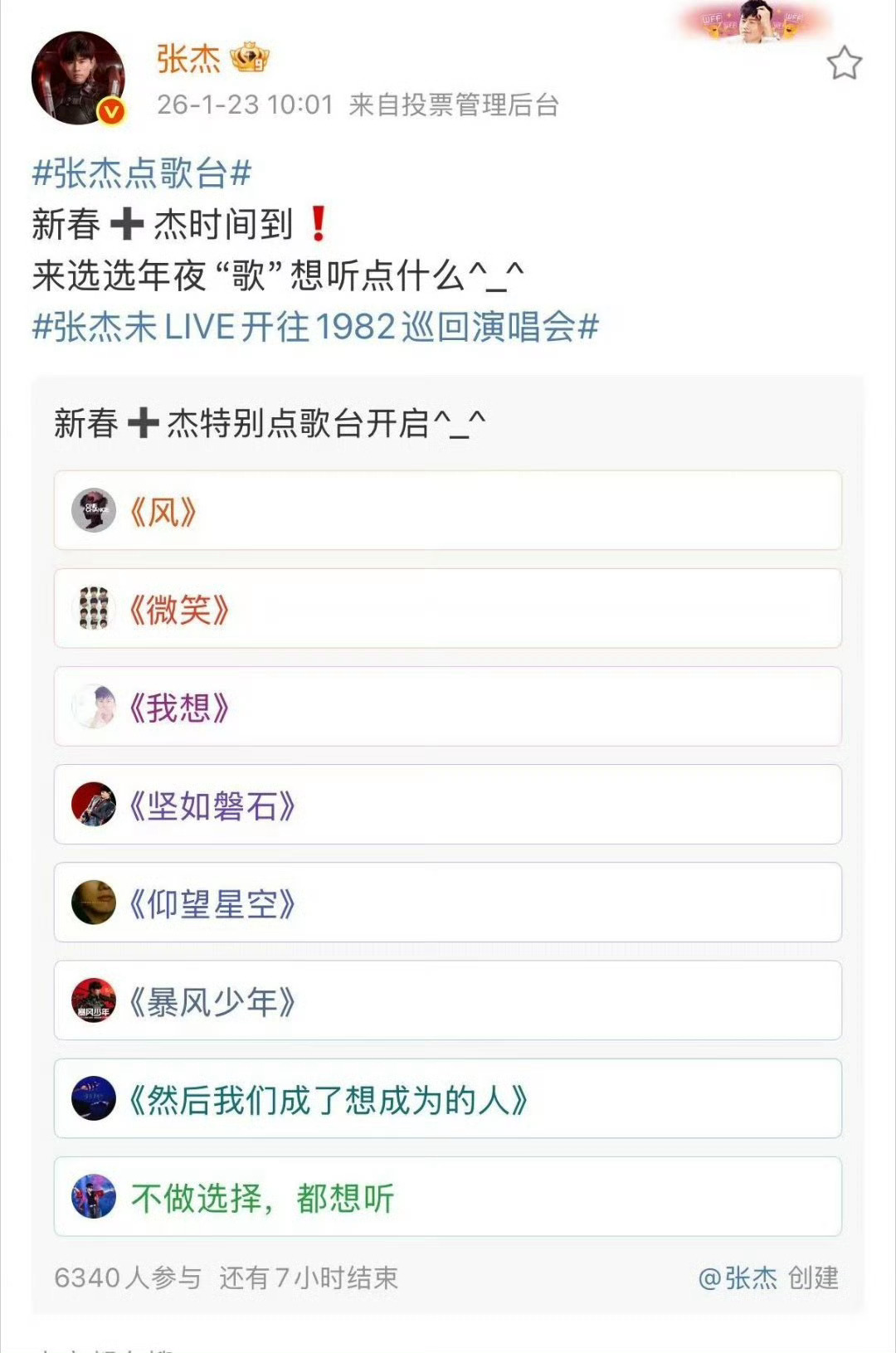 张杰粉丝有自己的年夜饭张杰居然让粉丝投票选年夜歌单,这波宠粉直接封神。每首歌都超想听,选择困难症当场发作,满脑子都是“我全都要”!已经开始掰着指头等过年,这才是粉丝专属的年夜饭嘛!
