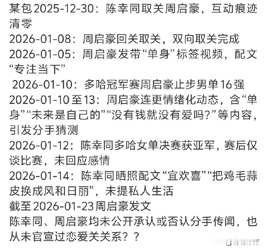 国乒这波“沉默分手局”,比比赛还抓马! 陈幸同和周启豪的互动一清零,网友的侦探DNA直接动了。从周启豪的“单身”标签,到“没有钱就没有爱吗?”的灵魂拷问,再到陈幸同“宜欢喜”的岁月静好文案,每一条动态都像在打哑谜。 其实大家都懂,运动员的压力已经够大了,不管是赛场输赢还是生活起落,都是他们的私事。比起蹲一个“官宣”,不如多看看陈幸同多哈亚军的精彩球路,或者期待周启豪下次比赛的爆发。毕竟,球台才是他们的主场,八卦只是场外的小插曲。