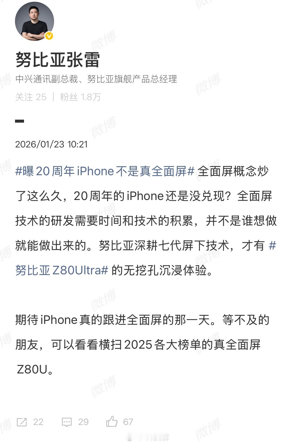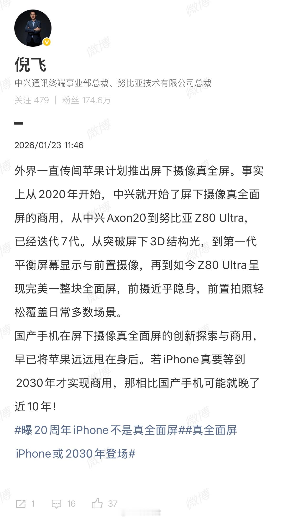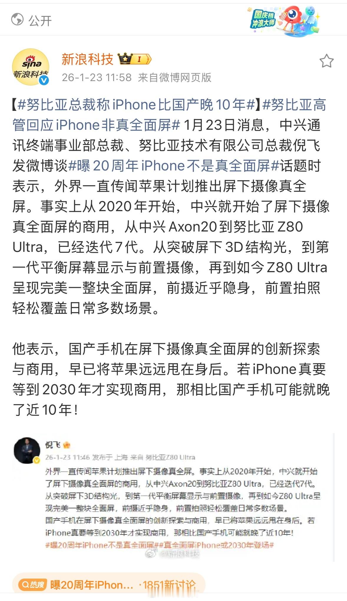努比亚高管回应iPhone非真全面屏努比亚总裁称iPhone比国产晚10年 本来说到2027年苹果用上屏下技术,爆料称到2030年才可能用上,对比中兴努比亚屏下技术的商用,苹果晚近10年啊!从中兴Axon20到努比亚Z80 Ultra,7代屏下摄像手机上市,苹果的屏下摄像不会真的等到2030年,才能够商用吧?