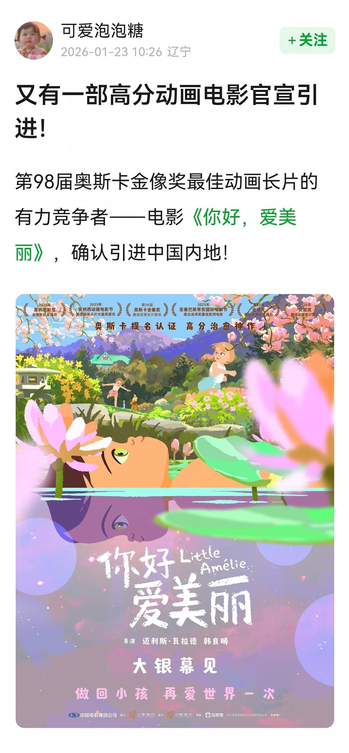 又有一部高分动画电影官宣引进,要去看~