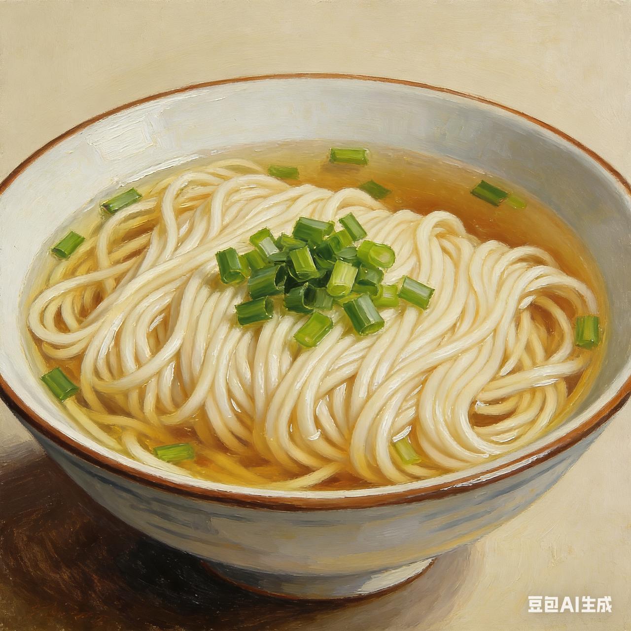电视里在演着阳春面的做法,突然间就很想吃阳春面。 于是自己做了一碗阳春面,烧点开水,碗里面搁一点猪油,又倒了一点酱油,把开水倒在碗里,汤色一下子变成了酱油的颜色。 把面条烫熟,捞出来放在碗里,再放一点葱花和香菜,最简单的阳春面就做好了,在上面放一点榨菜瘦肉丝,尝了一下可好吃了。 以后我把汤都喝完了,美哉了。