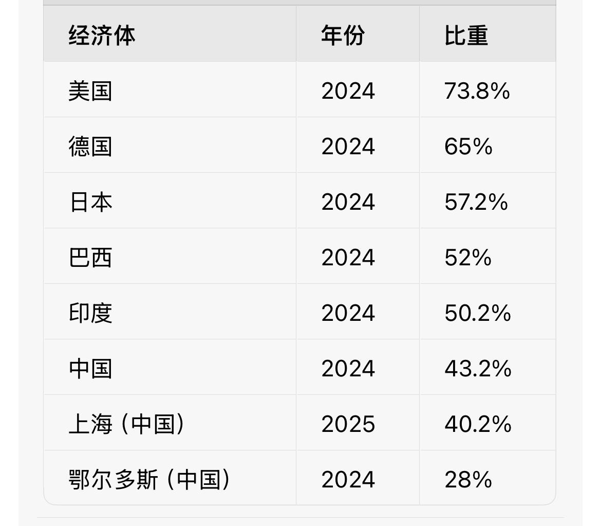 上海2025年人均可支配收入突破9万元达到91987元,可喜可贺。 9万元的人均收入从绝对数来看的话是很高的,位于全国第一。但从相对数来看的话是不高的。 衡量一个地区居民收入水平的重要指标是居民人均可支配收入占人均GDP的比重。 上海人均GDP是22.86万,人均可支配收入是9.2万元,人均可支配收入占人均GDP的比重是40%左右,低于全国平均数43%水平。 假如和全球其它国家比较一下,这个比重是处在中下水平,巴西是52%,印度是50%,日本57%,美国73.8%,德国65%。 假如上海人均可支配收入要达到人均GDP60%的话,人均可支配收入应该是13.7万元,这个数大致接近国际平均水平。 再来看看全国人均GDP最高的城市內蒙古的鄂尔多斯。 2024年鄂尔多斯人均GDP285338元,全体居民人均可支配收入53501元,占比约18.75%。说明这个城市的GDP里转化为居民收入的比重很低,是典型的高GDP低收入案例。