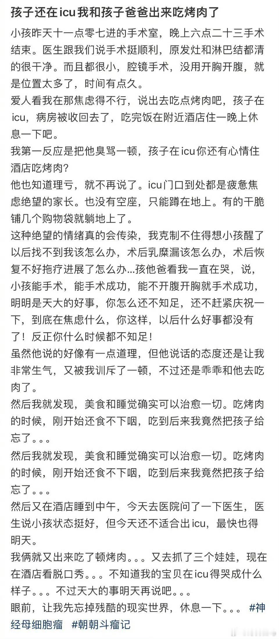 孩子还在icu我和孩子爸爸出来吃烤肉了存够能住两周ICU的钱就够了