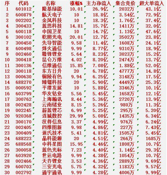 1月23日收盘,主力资金,已经大幅卖出的30名单: 新易盛:净流出 33.9亿元 特变电工:净流出 31.8亿元 中际旭创:净流出 30.4亿元 利欧股份:净流出 29.7亿元 工业富联:净流出 25.6亿元 三花智控:净流出 23.1亿元 中国长城:净流出 19.5亿元 沪电股份:净流出 16.6亿元 长江电力:净流出 11.7亿元 立讯精密:净流出 11.3亿元 1月23日收盘,主力资金“大幅买入”的30名单: 隆基绿能:净流入 26.9亿元 航天电子:净流入 18.8亿元 金风科技:净流入 18.3亿元 蓝思科技:净流入 15.7亿元 中国卫星:净流入 14.7亿元 乾照光电:净流入 12.7亿元 先导智能:净流入 11.4亿元 烽火通信:净流入 8.77亿元 赣锋锂业:净流入 8.23亿元 昆仑万维:净流入 8.20亿元 信维通信:净流入 7.08亿元 东方日升:净流入 6.78亿元 铜陵有色:净流入 6.25亿元 臻镭科技:净流入 5.90亿元 平潭发展:净流入 5.88亿元 华友钴业:净流入 5.45亿元 上海瀚讯:净流入 5.36亿元 云南锗业:净流入 5.26亿元 蔚蓝锂芯:净流入 5.25亿元 连城数控:净流入 5.08亿元