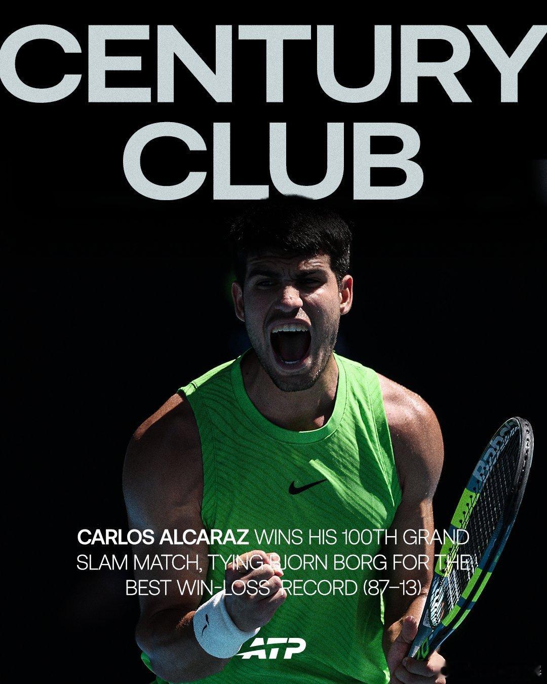 新纪录解锁 💯澳网2026 第三轮击败穆泰,是阿尔卡拉斯在大满贯的第100场比赛!总战绩为87胜13负,追平比约·博格并列公开赛时代第一 👍部分其他选手前100场大满贯比赛👇纳达尔 86胜14负辛纳 81胜19负费德勒 80胜20负德约科维奇 79胜21负网来不息ATP 阿尔卡拉斯晋级澳网男单16强