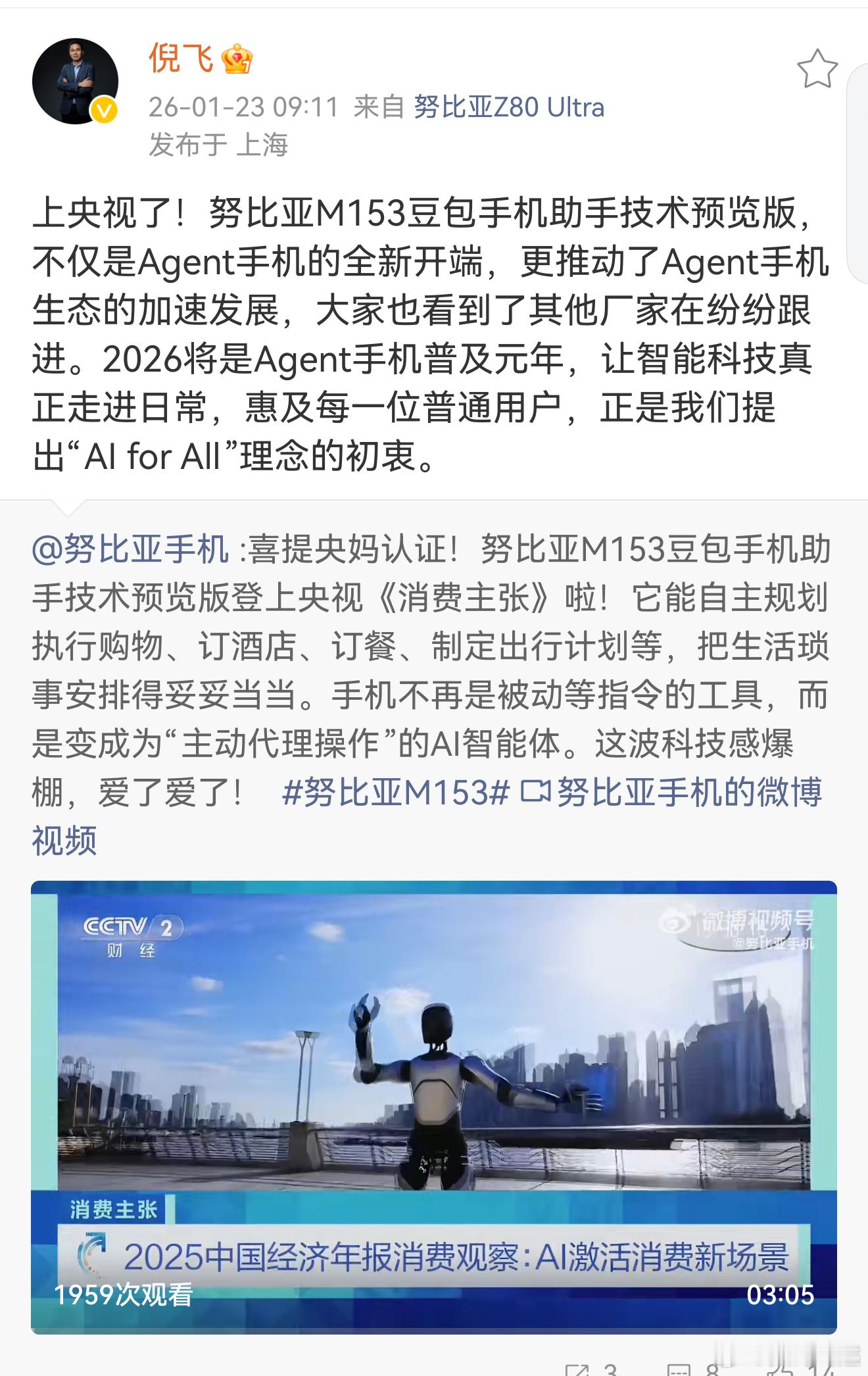 努比亚M153豆包手机真的排面了,这次直接上央视报道,这款产品的讨论度一直居高不下,我觉得主要还是因为其带来了很多大家意想不到的东西,倪飞总也转发,并且称2026将是Agent手机普及元年,对于这一点我非常认同,2026注将是不平凡的一年,手机行业也将迎来更大的发展,而AI绝对是主角,将会影响到大家的衣食住行各个方面,通过好用的功能,切切实实为大家带来很多的便利点,还是非常期待的!倪飞称2026将是Agent手机元年