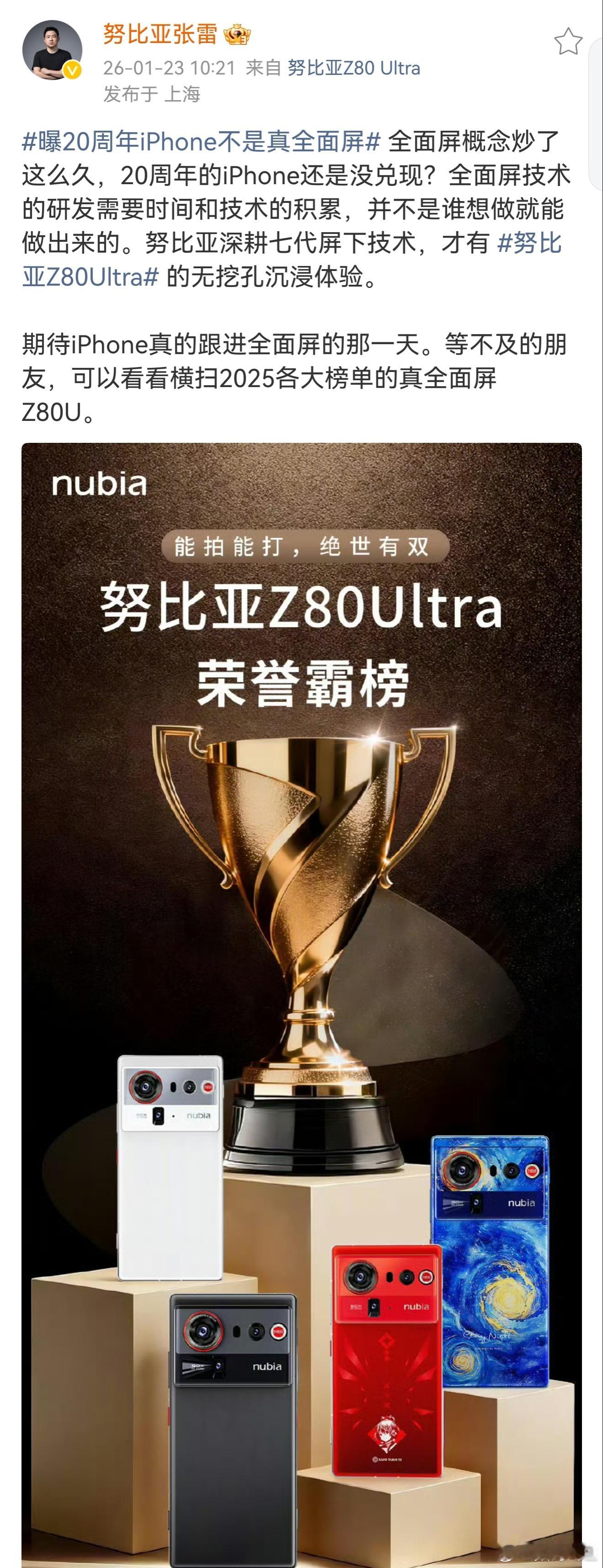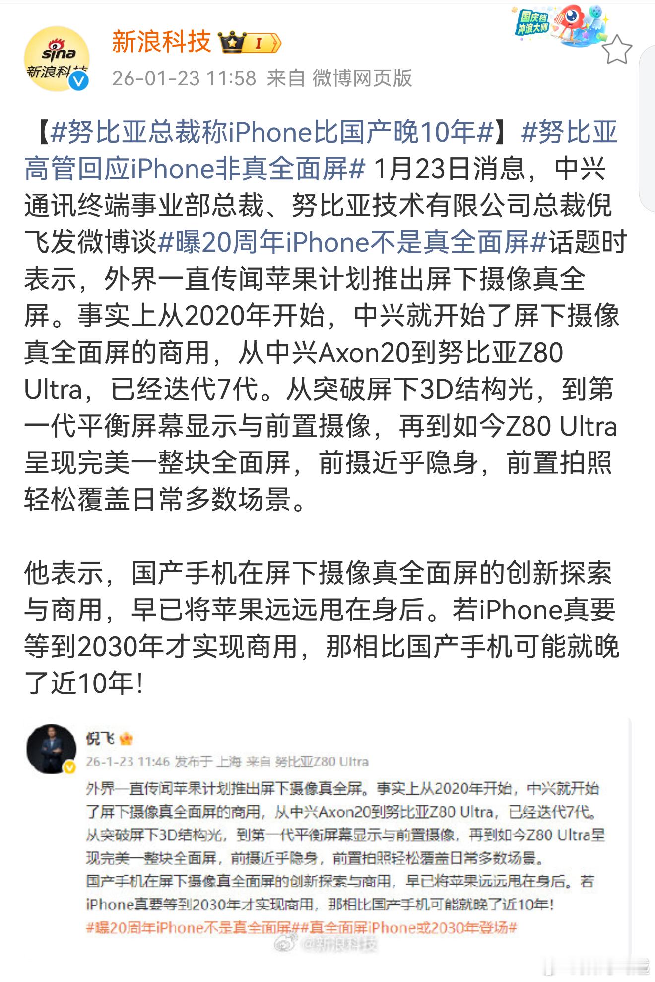 努比亚高管回应iPhone非真全面屏就在1月23日,努比亚总裁倪飞以及副总裁张雷发微博谈曝20周年iPhone不是真全面屏话题,从2020年开始,中兴就开始了屏下摄像真全面屏的商用,从中兴Axon20到努比亚Z80 Ultra,已经迭代7代。从突破屏下3D结构光,到第一代平衡屏幕显示与前置摄像,再到如今Z80 Ultra前摄近乎隐身,国产手机在屏下摄像真全面屏的创新探索与商用,早已将苹果远远甩在身后。若iPhone真要等到2030年才实现商用,那相比国产手机可能就晚了近10年!而作为一名使用者和行业从业者,你一定不会忽视中兴努比亚在全面屏所做的一切,那种正面一整个屏幕所带来的通透感和视觉震撼效果绝对是不一样的,如果iPhone要做的话,可能还真的好好学习下努比亚了!努比亚总裁称iPhone比国产晚10年