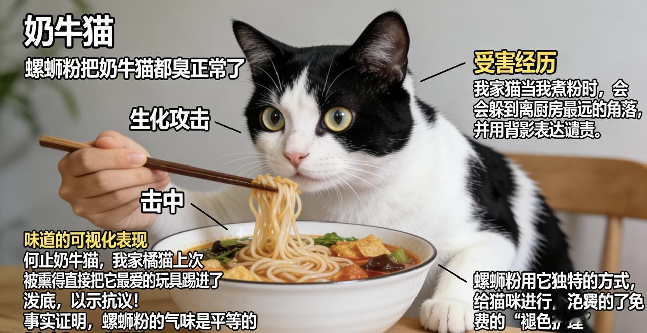 螺蛳粉威力有多大?奶牛猫被“臭到褪色”,网友:这波是味道可视化 一碗粉下肚, 黑白分明的奶牛猫, 生生被腌入了味儿。 最近,一则关于“螺蛳粉把奶牛猫都臭正常了”的趣闻悄然走红网络,引发了众多宠物主人和螺蛳粉爱好者的会心一笑与热烈讨论。 这听起来像是个夸张的段子,却精准捕捉了螺蛳粉那极具辨识度的“灵魂气味”与猫咪敏感嗅觉之间发生的奇妙化学反应。 事件的起源,通常是一位养了只毛色分明、黑白相间“奶牛猫”的铲屎官,在家大快朵颐享用螺蛳粉后,发现自家那只平日高冷的小猫,出现了令人捧腹的“异常”。 猫咪先是警惕地竖起耳朵,瞪圆眼睛,仿佛在确认是否遭到了“生化攻击”。随后,它可能会凑近碗边,小心翼翼地嗅探,紧接着被那股浓郁的酸笋味“击中”,一脸不可置信地后退、皱眉,甚至打出个小喷嚏。 最传神的描述莫过于“臭到褪色”——原本精神抖擞、黑白对比强烈的猫咪,似乎被这持续的气味“熏陶”得眼神茫然、生无可恋,那种“灵魂出窍”的呆滞模样,被主人幽默地形容为“颜色都淡了”,“从立体猫变成了平面猫”。 网友们纷纷晒出自家主子的类似“受害经历”,共鸣强烈: “我家猫当我煮粉时,会躲到离厨房最远的角落,并用背影表达谴责。” “何止奶牛猫,我家橘猫上次被熏得直接把它最爱的玩具踢进了沙发底,以示抗议!” “事实证明,螺蛳粉的气味是平等的‘攻击’,不分品种。” 更有才的网友戏称,这是“味道的可视化表现”,“螺蛳粉用它独特的方式,给猫咪进行了免费的‘褪色护理’”。 这则趣闻之所以能成为热点,正在于它巧妙结合了两大网络流行元素:一是长期稳居“网红美食”顶流的螺蛳粉,其“闻着臭吃着香”的特质自带话题;二是猫咪,尤其是表情丰富、行为呆萌的奶牛猫,本身就是互联网的“流量密码”。 它将美食与宠物互动的生活场景戏剧化,用一种夸张又贴切的比喻,勾勒出许多家庭都可能出现的趣味一幕,极易引发传播和再创作。 当然,玩笑归玩笑,从宠物健康角度出发,螺蛳粉这类重油、重盐、含多种调味料及刺激性气味的食物,并不适合猫咪食用。 其浓烈的气味可能会过度刺激猫咪敏感的呼吸道,而其中的成分(如葱蒜类调料可能对猫有毒)更可能对它们的肠胃和健康造成负担。 responsible的铲屎官们在享受美味时,最好还是在通风良好的空间,并确保美食远离好奇的猫主子,既保护它们,也让自己吃得安心。 这场由一碗粉引发的“猫咪变色”奇想,终究是网友们对生活趣味的捕捉和分享。它让我们看到,在柴米油盐的日常里,与宠物相伴的点滴瞬间,总能酝酿出意想不到的快乐。 你的猫咪,对你吃的哪种食物反应最大呢?欢迎在评论区分享你的故事!