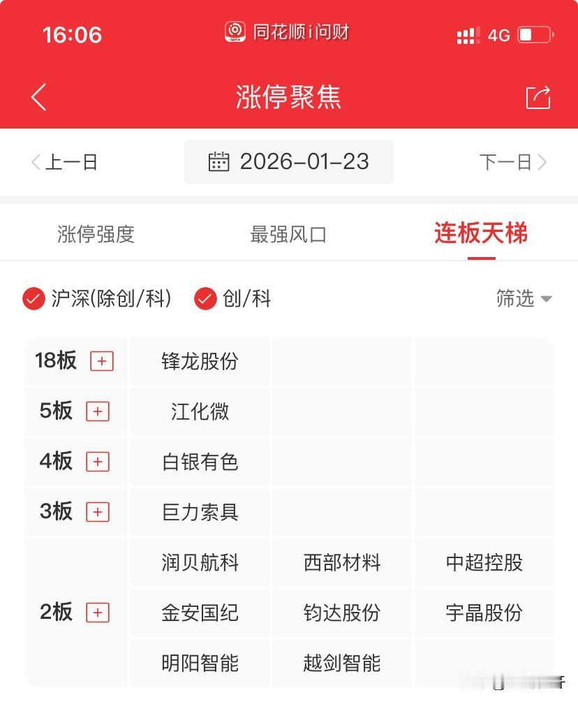 锋龙18板,马上要到20板的位置了,完全独立的走法,没有提前埋伏也就没什么参与机会,只有恭送。 江化微不让盈可微,盘中有开回封,时间短,没法充实,周一有可能断了,相反,盈可微只有一线生机,十分钟内无法反包回去,也是退潮结局,这两都有三个一字,买点其实也没有,只是看看,得有一个芯片方面的龙头顶着。 白银就算了,连白银ETF都停牌了,看样子还是发现晚了,昨天也犹豫没有买。 二进三,独苗巨力,其它七个全挂了,另外一个看好的综艺,真的成综艺了,主要还是上面有芯片龙头了,周一机会也不大。巨力,作为航天的新进补涨龙,算尽力了,希望还有两个板高度,这样加上航天电子中军,航天周一也许还有转强机会,同样需要跟今天一样看巨力、航电的强度,如果小高开或者平、水下开,航天分化概率也大。二板没啥看的,中超走连板,没有换手,估计也就随航天核电反弹。整个航天前期高折扣股,反弹无量,仅此反弹了。 先看周末的风头吹向吧。航天核电,今天轮到,下周一是否就是分歧,轮芯片机器人了,多防这手。