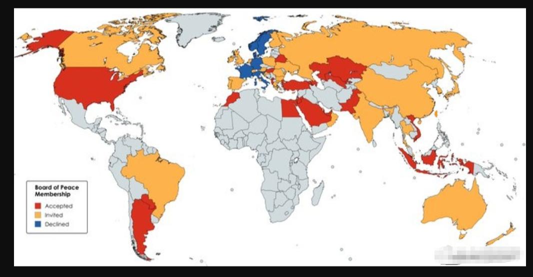 董王成立了一个翻版“联合国”? 也许是想让自己青史留名,也许是想绕开联合国做一些其它事,董王居然成立了一个和平委员会,向许多国家发出邀请,看起来像是一个小的联合国。 就是退了旧群建个新群。 当然,作为全球当年的霸主,还是有许多国家买账的。 但是,作为联合国五常,除了他自己在张罗,没有一个国家同意入会。 中俄自不必说,连他的小弟英国和法国也根本没考虑。 咱就是说,如果五常无人加入,这个和平委员会有多少含金量呢? 下图中,红色是的确定要入会的,蓝色的是确定不入的,黄色的是收到邀请,但不表态的。 如果最终结果还是这个,他会不会非常尴尬?