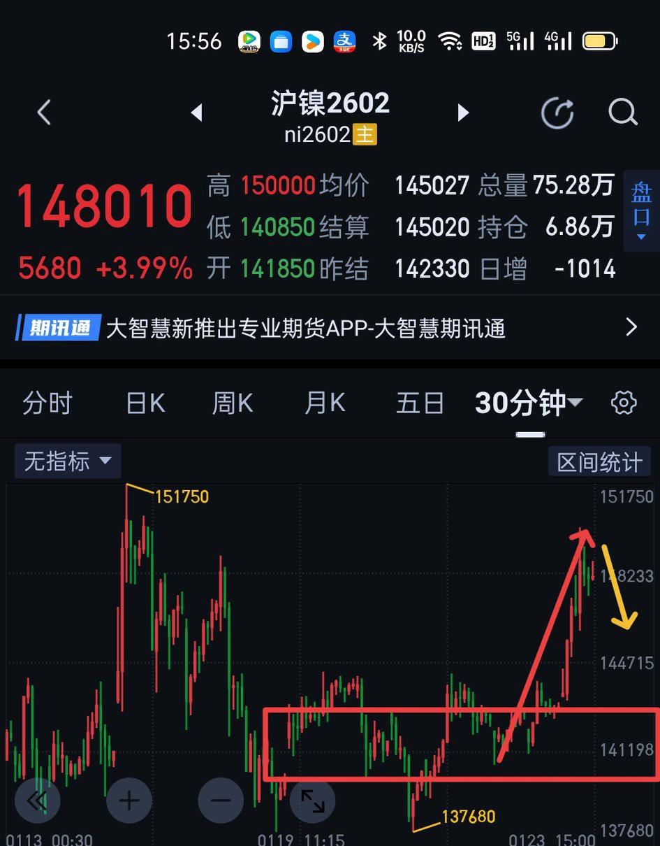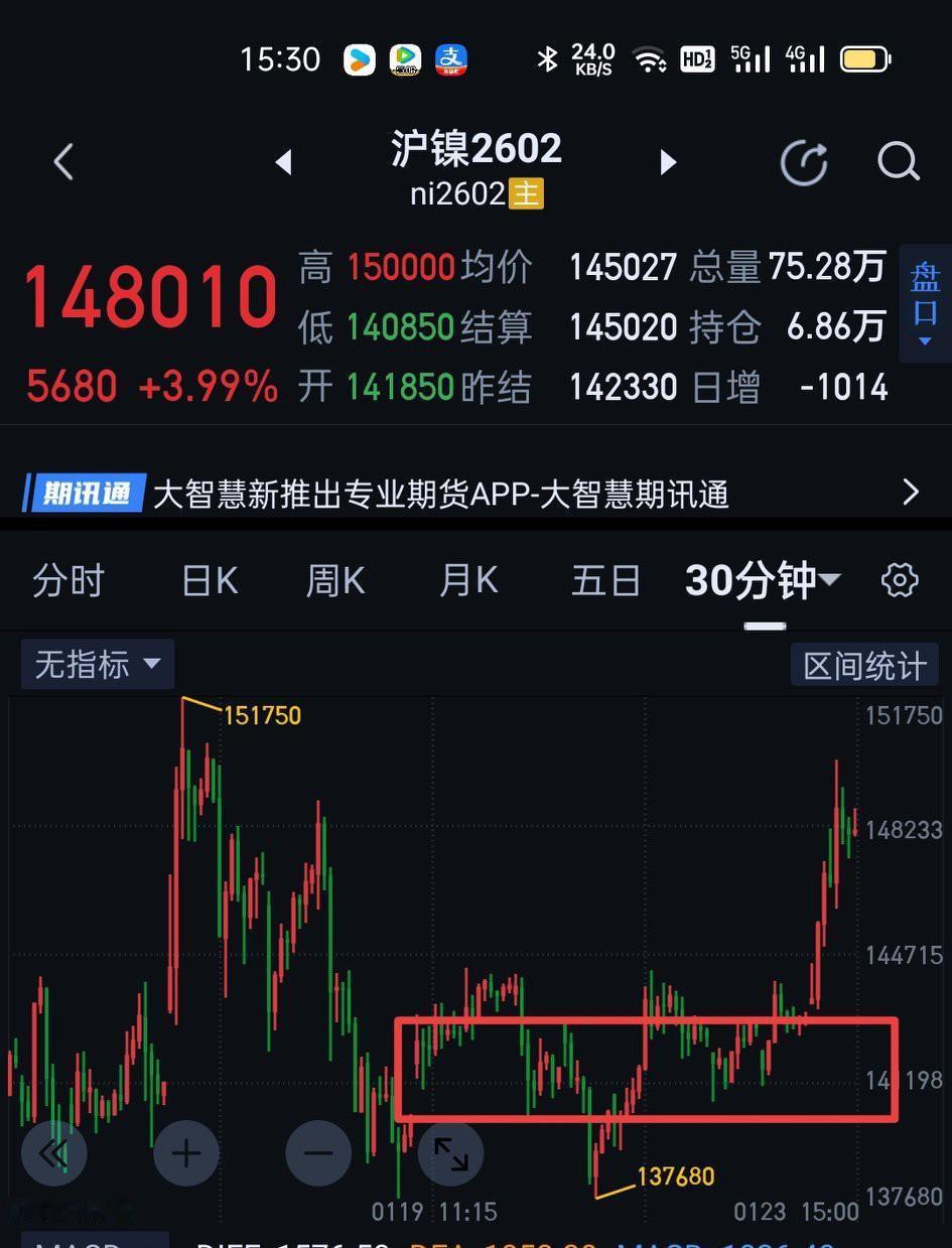 沪镍2602,夜盘,如能挑战150000高点,还可以谨慎看多,但要时刻观察5分钟上的卖点呈现,继而引发三十分钟一笔上完成。目前结构,围绕前面5分钟中枢并未形成背驰,如后市产生三十分钟一笔回调,暂可当三买点形成去观察(必须以走势为准,一切皆有可能,不可妄做预判)。如三买形成,151750以来的调整将有望结束。