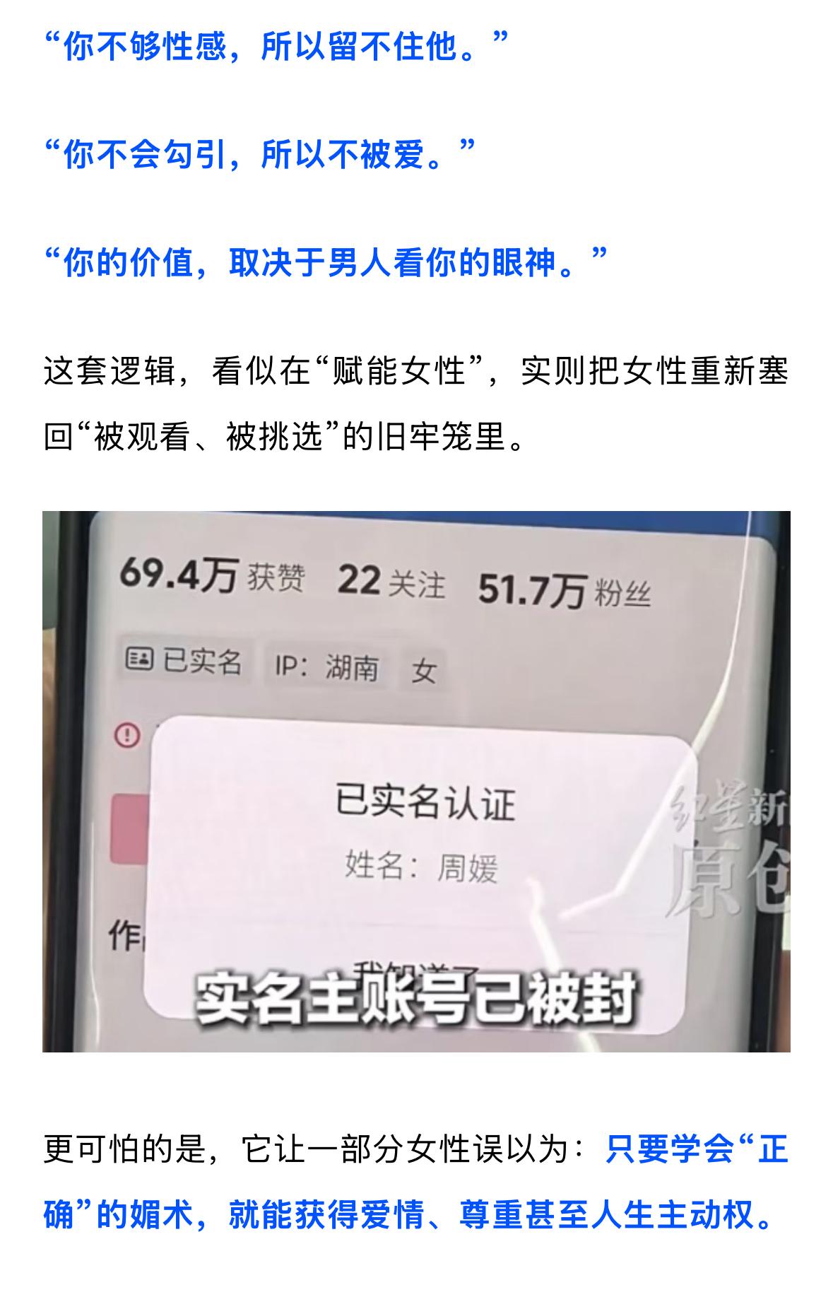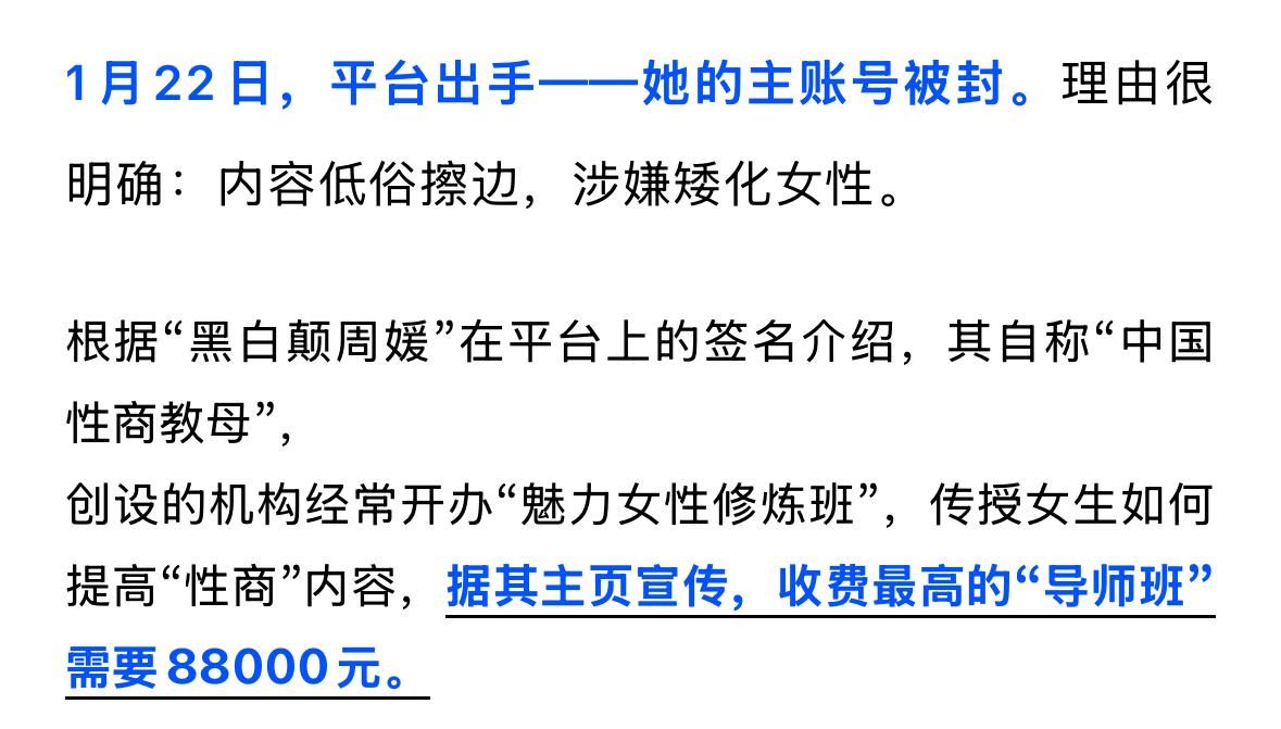 看到新闻说,这位“黑白颠周媛”的网红全平台被封了 第一次看到她的视频,第一反应是,大家娱乐一下就好了,如果真的买她的课,那真的是你太善良了,这样也能被骗~如果男人不爱你,就自爱。