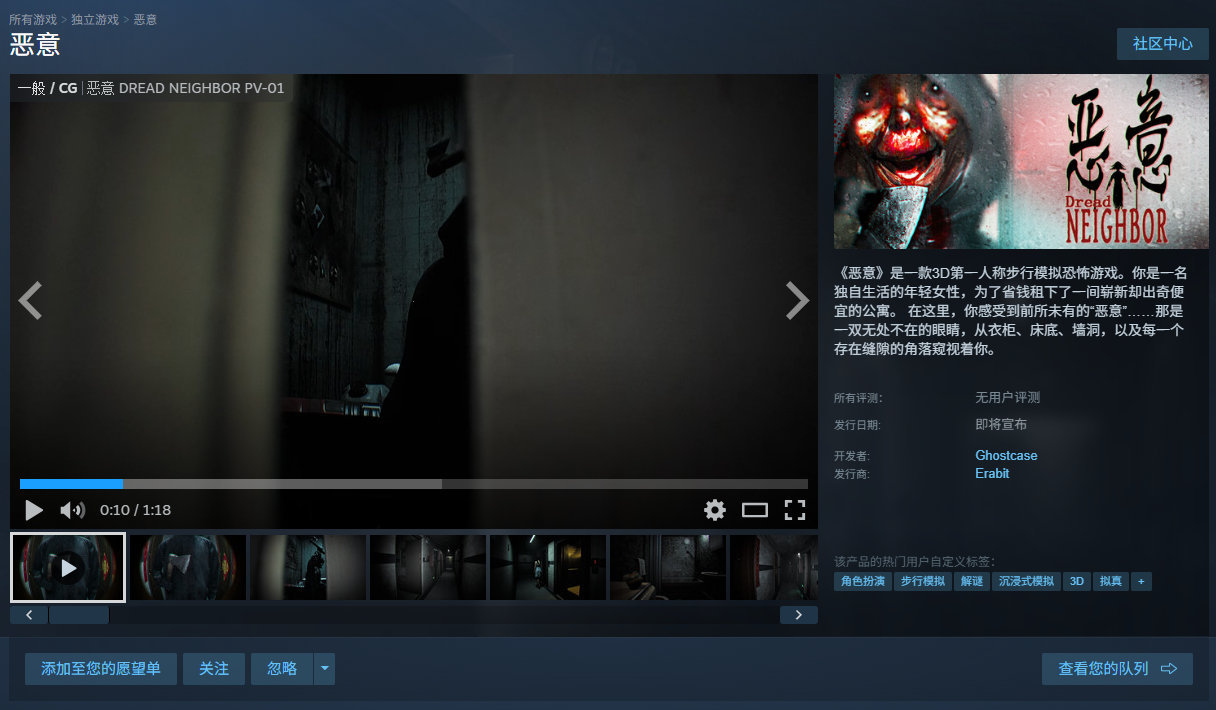 第一人称步行模拟恐怖游戏《恶意》试玩Demo已上线Steam商店页面,发售日期待定,支持中文。玩家将扮演一名独自生活的年轻女性,为了省钱租下了一间崭新却出奇便宜的公寓。在这里,你感受到前所未有的“恶意”——一双无处不在的眼睛,从衣柜、床底、墙洞,以及每一个存在缝隙的角落窥视着你。