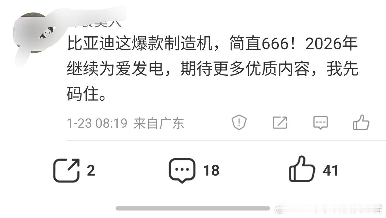 这个意思是让我2026年继续为爱发电,我发比亚迪的内容确实有流量,🍠的热门帖子挺多的。但我觉得这位网友可以换一个祝福的话。优质内容我会继续创作,只不过,微博可能不是主要的平台了。虽然我现在是成为了他们眼中的路边一条,但我也得有自己的规划,他们不要我我就另寻出路呗。这年头,当迪粉本来就不容易,还要经常挨骂。多出去转转,其实也是好事。