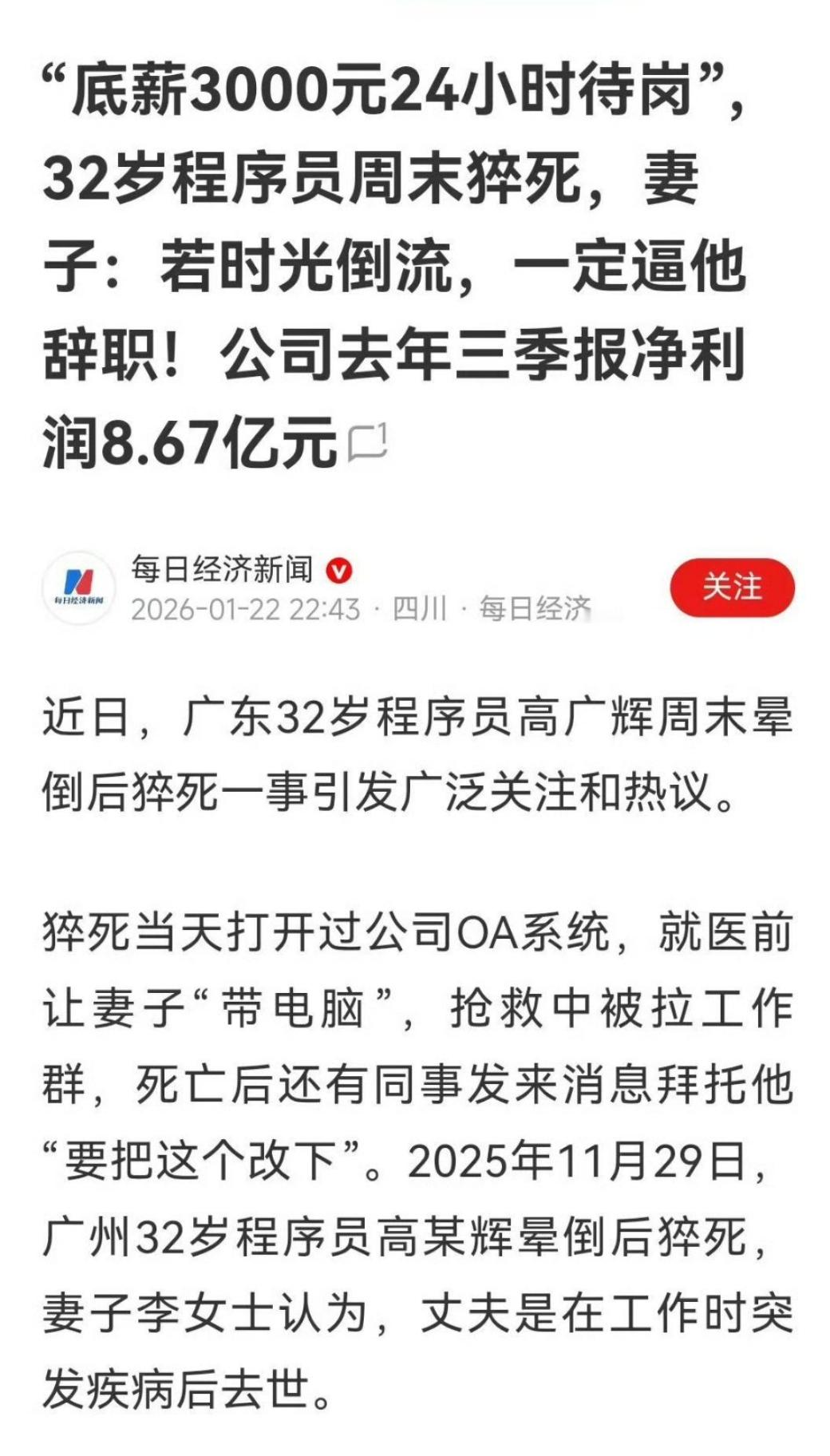32岁程序员周末晕倒后猝死 广州还有底薪3000的程序员工作吗?这个新闻前几天看过了,没想到还有这些内情从遗孀的小红薯上看过一段,说他老公是今年没的第三个广州黄埔这个公司,好几个亿的净利润是靠压榨来的嘛这个社会怎么了,以压榨为荣?为什么猝死的新闻屡见不鲜